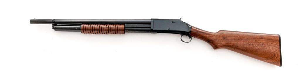 IAC Model 1893/97 Slide-Action Shotgun, #0602265. 12 ga. 20" plain barrel has a 2-3/4" chamber and is choked Mod. Action is made to look like a Winchester Model 1893 but has all the 1897 improvements. Receiver and barrel are deep blue and unengraved. Tubular forend and Prince of Wales buttstock are walnut, with a black buttplate. Mfg'd 2006 by SD Rizhou in China. Condition is like new showing little use, mostly by cowboy action shooters. Action cycles well and closes tight; bore is mirror bright. Est.: $400-$500. (Modern)