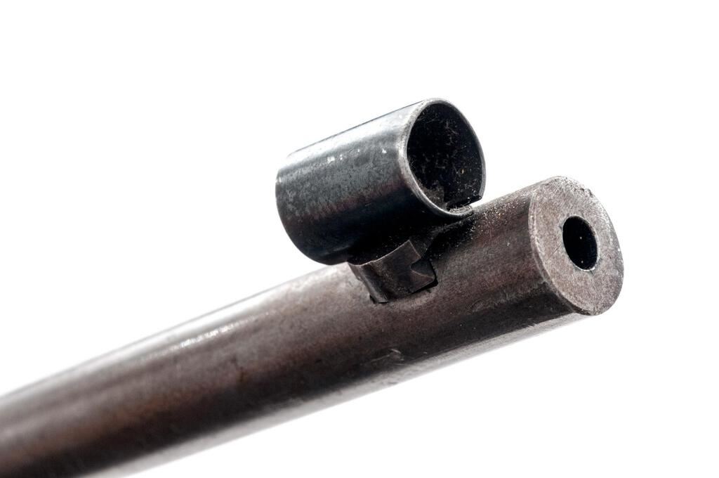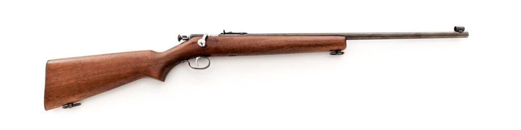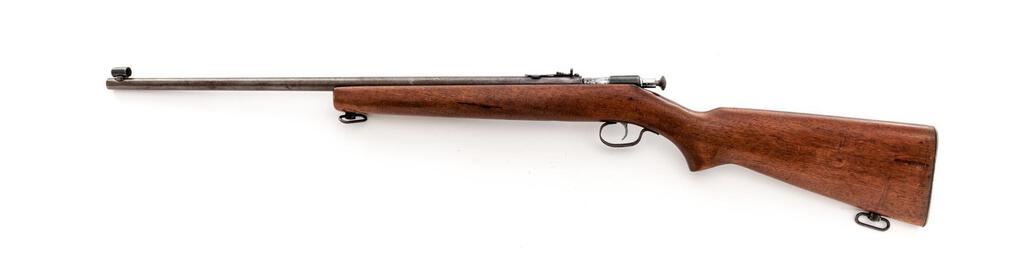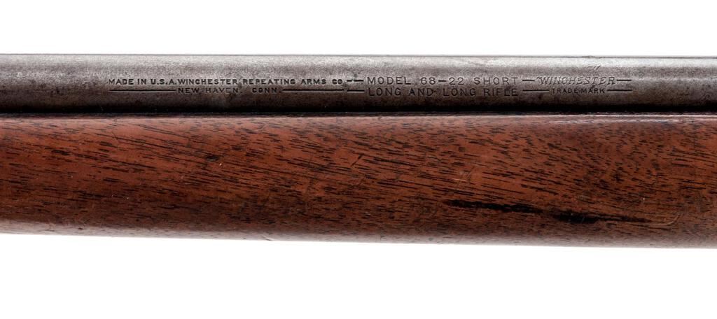 Winchester Model 68 Bolt Action Single Shot Rifle, NSNV, .22 S/L/LR cal., 23" with a later replacement hooded globe style front and replacement Marbles semi-buckhorn rear sights, blue finish, smooth walnut one-piece pistol grip stock with a checkered steel buttplate, sling eyes and swivels and chrome bolt. Although not serialized, the Model 68 was mfg'd from 1934-1946. Rifle is in good overall condition, the metal surfaces having gone to an even patina with traces of original finish in protected areas. Markings are sharp and there is a crisp Winchester "WP" proof on the barrel, just in front of the chamber. Walnut stock is good with mars, dents, and scratches consistent with carry and use. Action works well, bore is good. Est.: $150-$200. (C&R)