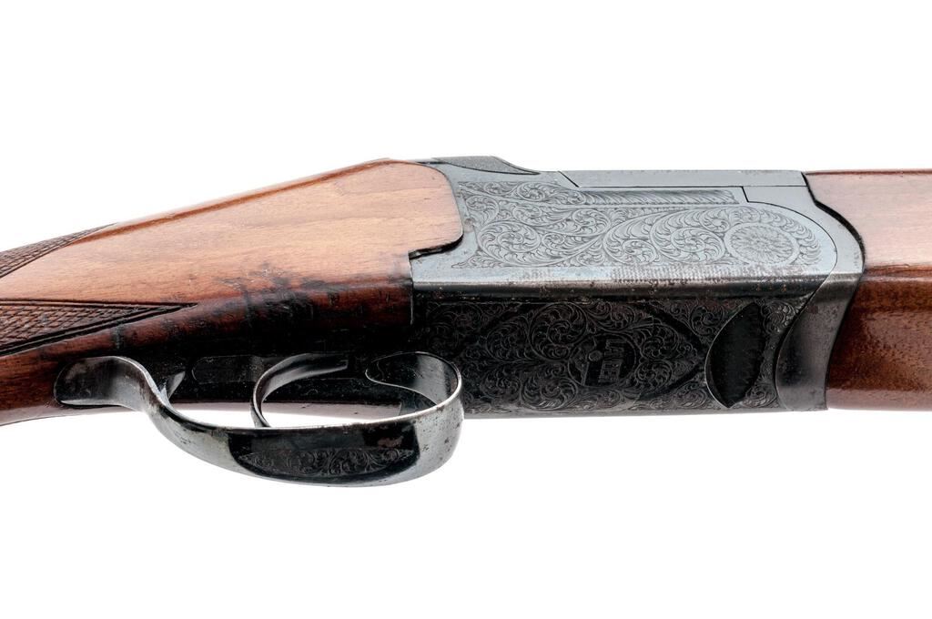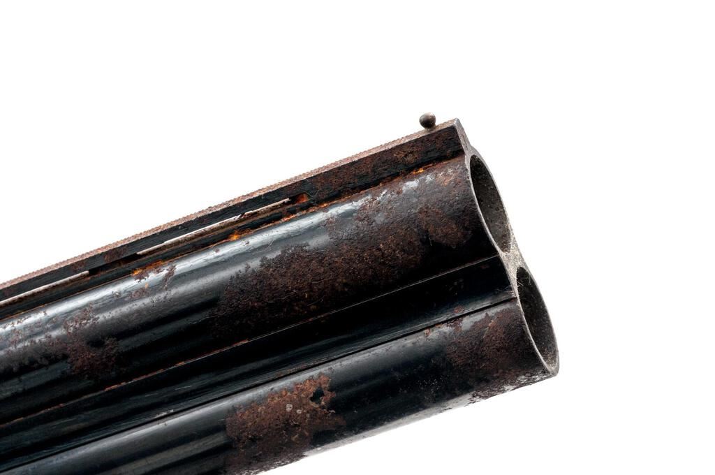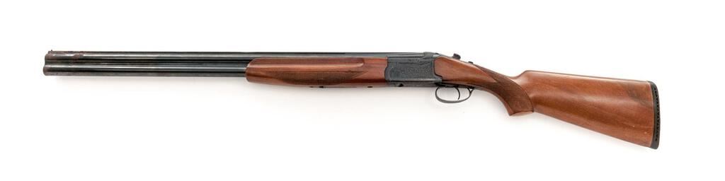 Harrington & Richardson Model 1212 Over/Under Shotgun, #IG1774731270. 12 ga. 27.5" vent rib barrels have 2-3/4" chambers and are choked Mod./Full. The boxlock action features a single selective trigger, automatic safety, and simple extractors. The finger-groove forend and pistol grip buttstock are European walnut and feature good checkering and a slender buttpad. Made by Lanber in Spain for H&R in the late 1970's. Condition is good, with significant rust to the barrels at their muzzles. Additional lesser damage to the receiver, and numerous small handling marks to the wood. Action closes tight and function well; bores are good. Est.: $250-$400. (Modern)