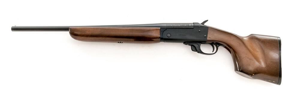Savage Kimel Kamper Model KK2 Single Shot Shotgun, #C816853. .410 bore, 18.5" plain barrel has a 3" chamber and a Full choke. Boxlock action has a release in the trigger guard, half-cock safety, and auto ejector. Full forend and short pistol grip handle are stained hardwood, with storage for extra rounds in the butt. Mfg'd approx. 1980. Condition is near excellent, with slight marks to wood but little wear to metal or action, which closes tight and functions correctly. Bore is bright. Est.: $200-$250. (Modern)