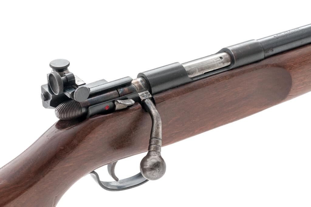 Remington Model 521-T Junior Special Bolt Action Rifle, NSNV, .22 S/L/LR cal., 25" round barrel, Redfield globe style front sight and no accommodation for a rear sight, Lyman aperture sight at the rear of the receiver, blue finish, smooth wood one-piece target stock with an accessory rail and sling swivels, and 6-rd. detachable Remington marked magazine. Mfg'd 1948. Rifle is in near fine overall condition retaining approx. 90%-92% toning blue finish, with light scratches and some discoloration at the front ring. There is scattered fine surface rust on the magazine well and trigger guard. Rear of the bolt, bolt handle and trigger show muted case colors. Smooth wood target stock is in good condition with a couple of 1.25" lateral cracks and a crude repair at the front of the forend. Buttstock ends with a black spacer and a replacement White Line solid rubber recoil pad providing a 12.25" LOP. Action works well, bore is bright with crisp rifling. Est.: $300-$400. (C&R)