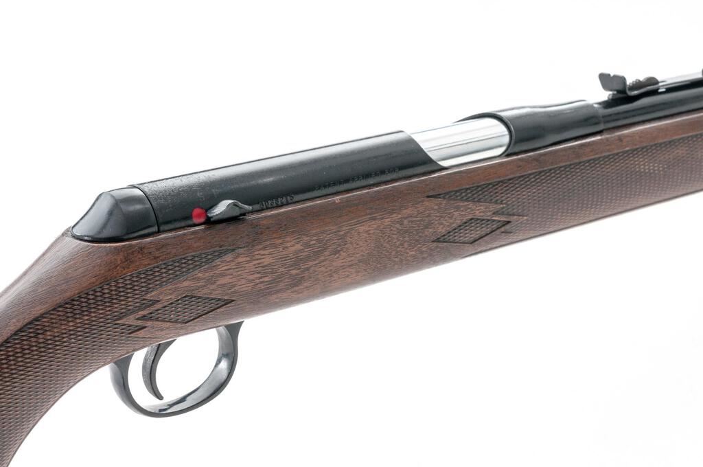 Daisy VL Caseless Standard Rifle, #A038215, .22 cal., 18" barrel, ramped blade front and standard elevator rear sights, black finish, checkered plastic wood grain finish one-piece stock. Includes approx. 1,200 rounds of Daisy .22 caseless ammunition in 100 round boxes. These rifles were of limited production from 1968-1969 with a total production of approx. 18,000. Rifle is in fine overall condition retaining approx. 92% factory finish, with light wear at the muzzle and a couple of small scratches, primarily on the barrel. There is light surface rust at the rear of the receiver and a couple of small mars on the trigger guard. Checkered plastic stock is in good condition. Action functions well, bore is bright with defined rifling. Est.: $300-$400. (C&R)