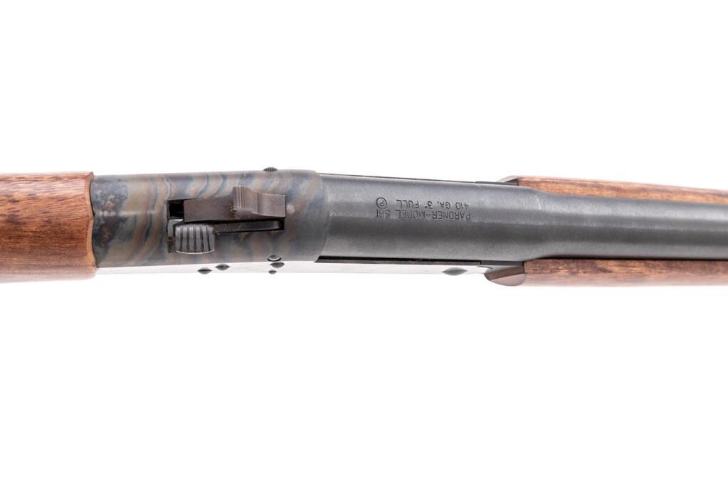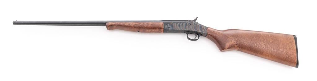New England Firearms (NEF) Pardner Model SB1 Single Shot Shotgun, #NJ265101, .410 ga., 26" barrel, brass bead front sight and no rear sight, blue and case hardened finish, smooth wood two-piece pistol grip stock, beautifully case hardened receiver and Schnabel forend. Shotgun is in near excellent overall condition retaining approx. 96%-98% blue and case colored finish, showing only light handling marks and little use. Smooth wood stock is very good with handling and storage marks only. Buttstock ends with a hard plastic NEF marked buttplate providing a 14.25" LOP. Action locks up tightly, bore is very good. Est.: $150-$300. (Modern)