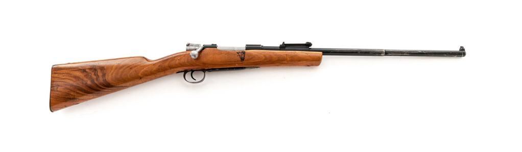 Modified Spanish Model 1893 Mauser Bolt Action Rifle, #E5494, 7x57mm, 22.4" barrel, black-painted finish, hardwood stock, inverted "V" front sight and adjustable folding leaf rear sight. Marked on top of receiver ring "(Crown)FABRICA DE ARMAS/OVIEDO/1898". Mismatched numbers on bolt handle. Rifle has been modified by cutting back and re-shaping barrel and forend, bending bolt handle, and removing buttstock sling mount. Condition is good as modified, with the metal retaining approx. 60% finish. Wood has had added varnish applied, now in good condition, with a drilled hole in the butt; gouges and overall handling marks to the finish. Action operates smoothly; bore has darkening in the grooves, otherwise good with good rifling. No visible import marks. Est.: $200-$300. (Modern)