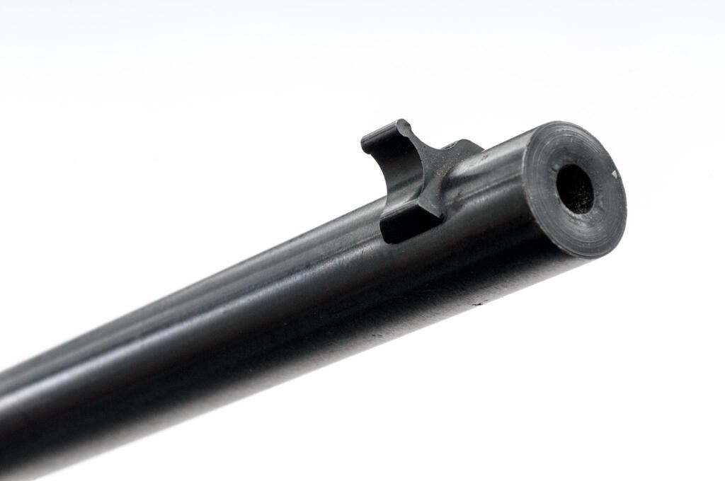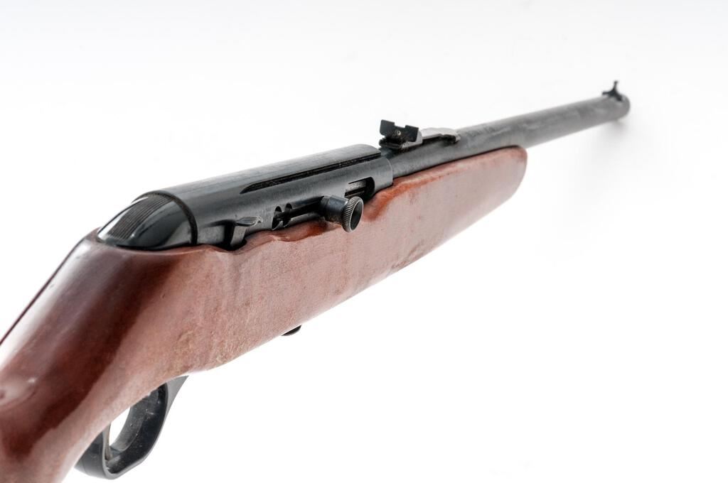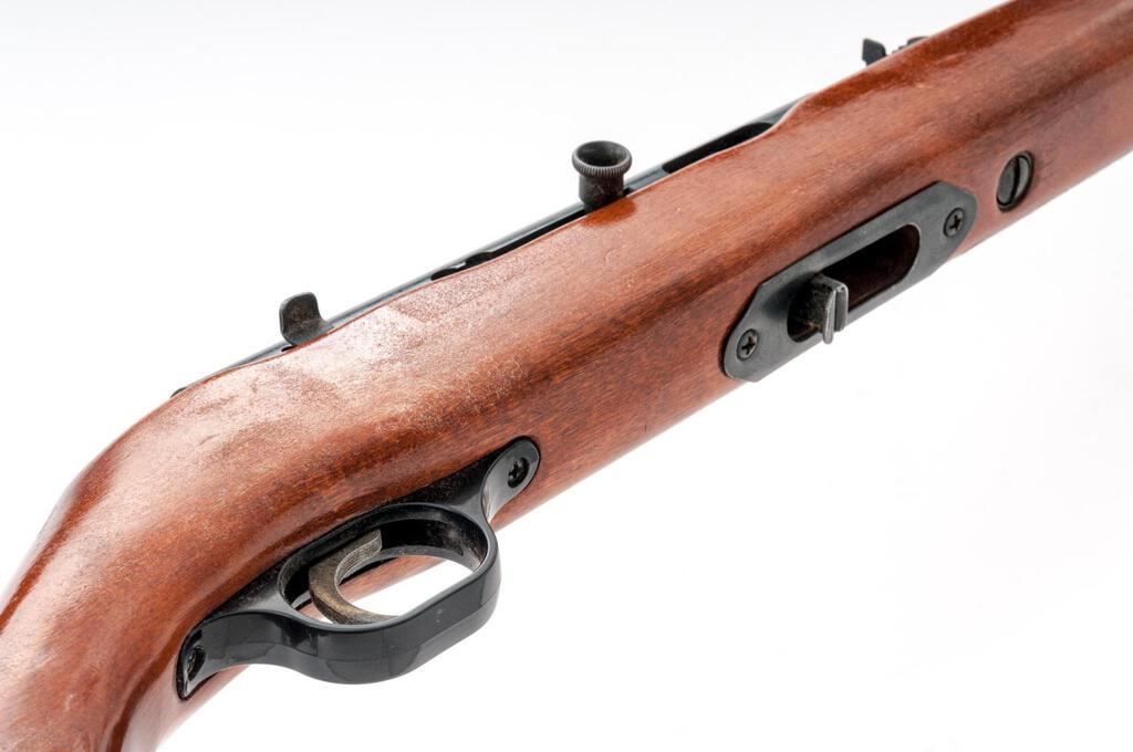 Mossberg New Haven Model 250C Semi-Automatic Rifle, NVSN, .22 SHV-LR cal., 18.25" barrel, blue finish, one-piece pistol-grip hardwood stock with black plastic buttplate; blade front sight and square-notched rear sight with elevator. Receiver is factory grooved for scope rings. No magazine. Condition is good retaining most of its original metal finish. There are a few tiny specks of surface rust on the barrel. Stock needs to be cleaned or refinished; doesn't show much handling wear, but the finish is tacky and now has unknown fibers adhered to the finish on the left side. Action is smooth, bore is bright with excellent rifling. Est.: $80-$120. (C&R)