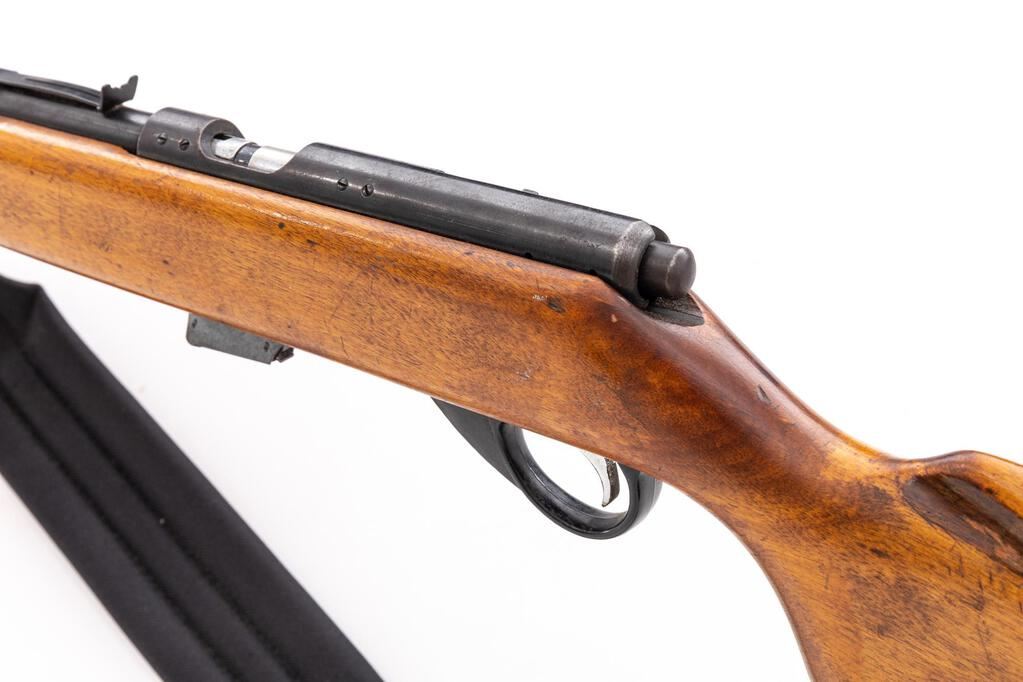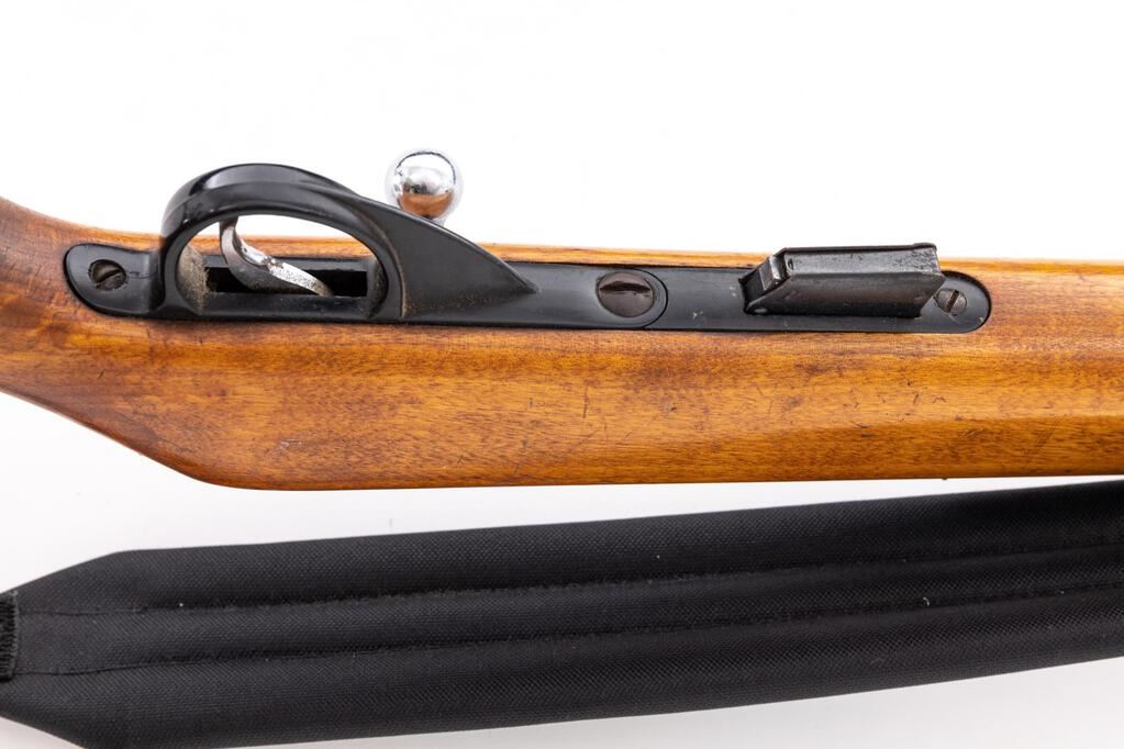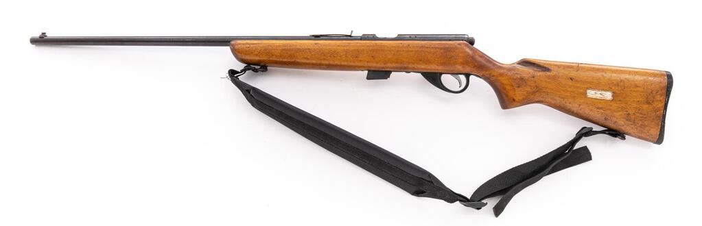 J.C. Higgins Model 103.16 Bolt Action Rifle, NSNV, .22 S/L/LR cal., 24" barrel, dovetailed brass bead blade front and standard rear sights, chrome bolt, blue finish, smooth wood one-piece pistol grip stock with sling swivels, padded nylon rifle sling, ribbed plastic buttplate, and one 7-rd. detachable box magazine. Rifle is in good overall condition retaining a considerable amount of toning blue finish drifting to plum patina, scattered light surface rust and erosion, and a plastic trigger guard. There are four holes on the left side of the action for a side mount; all are filled with tap screws. Smooth wood stock is in good condition with mars, dents and wear. There is a vacant 1.5" rectangle on the left side of the buttstock where an inlay has been removed. Action functions well, bore is good. Est.: $100-$200. (C&R)
