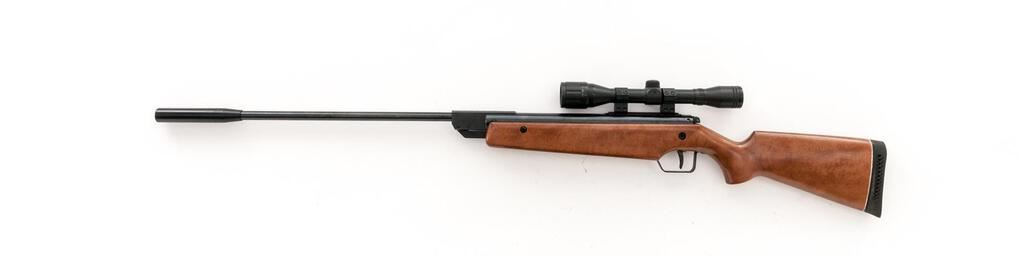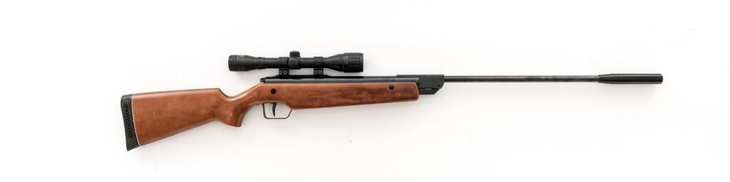 RWS Diana Model 45 Single Shot Air Rifle, #321926, .177 cal., 24" barrel, front and rear sights and a stabilizer added, blue finish, smooth wood one-piece pistol grip stock with ventilated rubber recoil pad. Topped with a one-piece base, rings, and an RWS 300 fixed 4x rifle scope in matte finish with an adjustable objective and duplex reticle with clear optics. Lot includes the front and rear sights. Rifle is in very good overall condition with light scratches and handling marks. Left side of the action is marked "MADE IN GERMANY". Smooth wood stock is very good. Action locks up tight, bore is good. Est.: $150-$250.