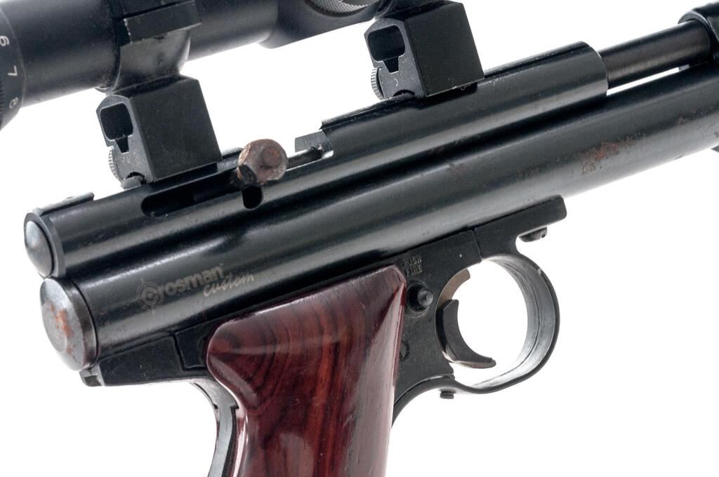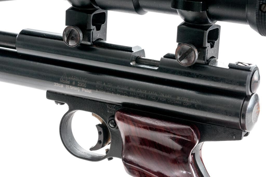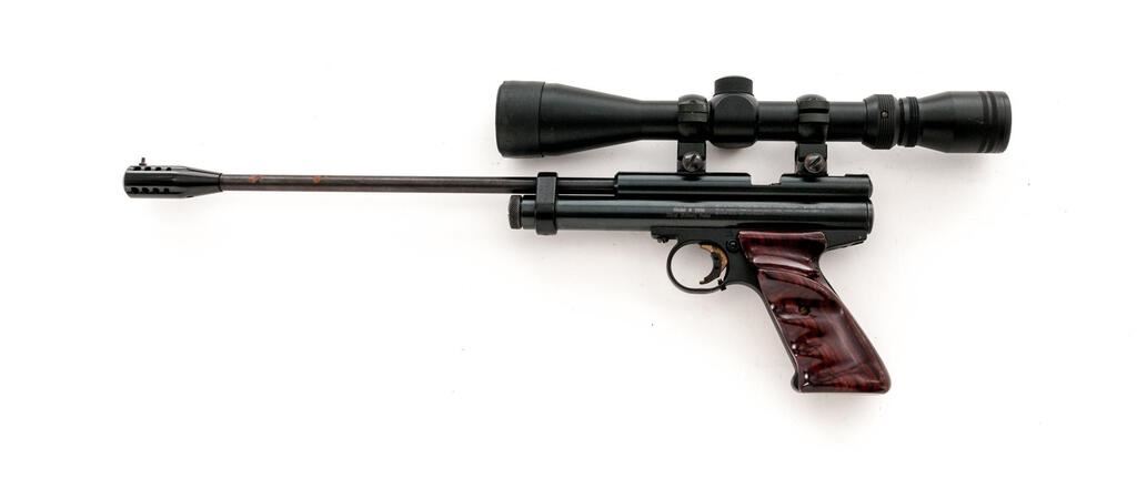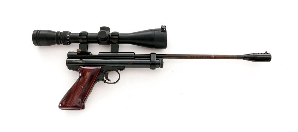 Crossman Model 2300 CO2 Powered Air Pistol, #SPW642696, .22 cal., 16" barrel including muzzle device, blued finish, smooth wood grips, topped with an AIM 3-9x40 scope. Pistol is in overall good condition. Metal surfaces have scattered rust and pitting on the air tube and cocking piece, and a majority on the barrel. Wood grips exhibit minor scuffs and handling marks. Pistol has not been tested for function, and there is an empty CO2 container in the tube, which we are not able to remove. The AIM scope is in very good condition, medium crosshair reticle is clear; front objective is covered by an unmarked scope cap with a broken hinge. Est.: $80-$120.