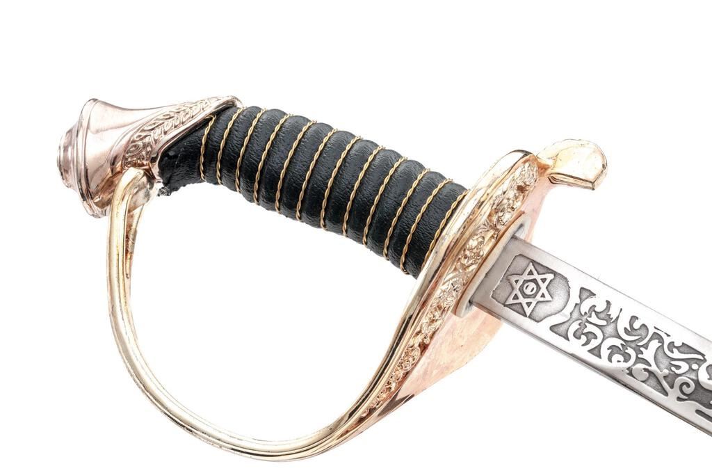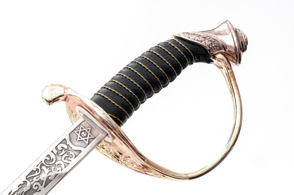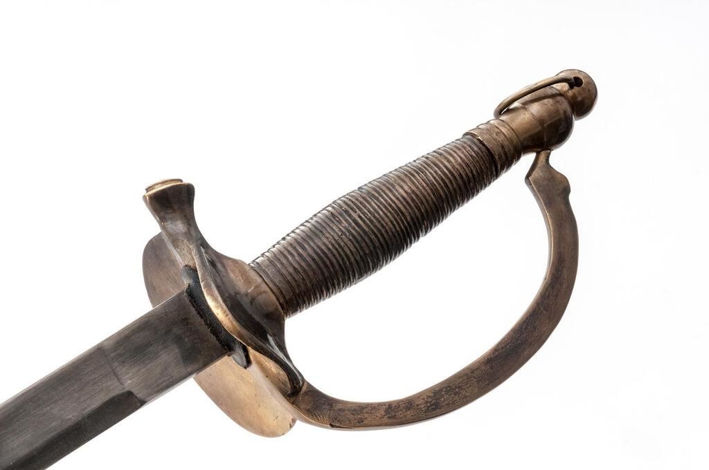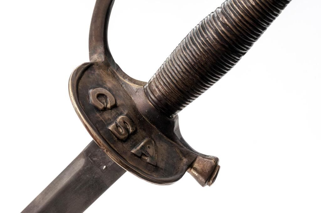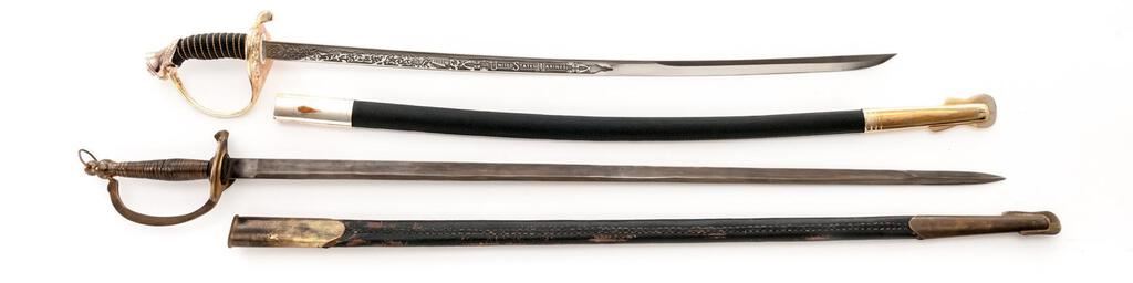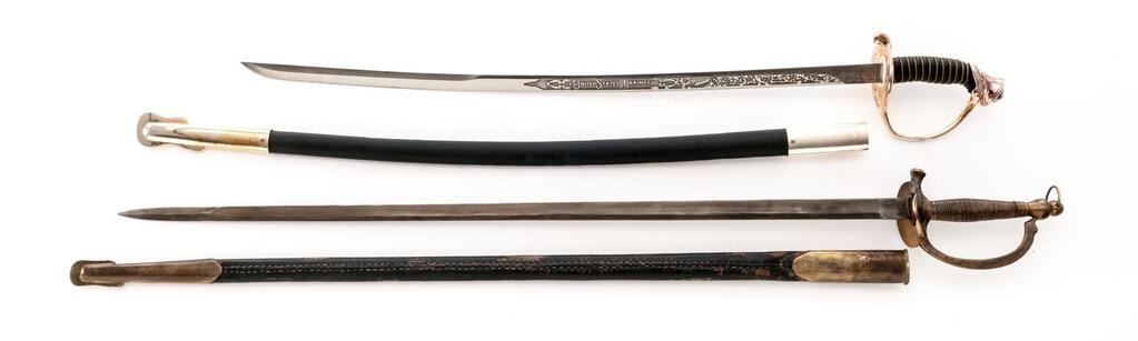 Lot of Two (2) Reproduction Swords: (1) Modern reproduction of the U.S. Marine Corps enlisted man's dress sword. Etched decorated bright steel blade with "United States Marine Corps" embossed. Blade has been sharpened. Silver/gold colored plated guard and pommel with pierced floral designs. Leather covered grooved handle with twisted wire wrapping. Leather covered metal scabbard with silver/gold colored plated fittings at top and bottom. White leather frog does not have a hole for the frog stud, and has a small piece cut from the back side. Blade measures 29.75", OAL is 39". Condition is as new with little to no wear and light oxidation to the plated metal surfaces. Leather on the grip is loose near the top edge. White leather frog shows light soiling and cracking to the finish. (2) Repro Confederate Musician's Sword, with leather scabbard. Crude cast grooved grip and clamshell guard with C.S.A. embossed. Thin bow knuckle guard attaches to rounded pommel with round top nut. Wire knot hanger at top nut. The 36" blade is plain with a wide groove near the top spine. Scabbard is leather with brass fittings at top and bottom, the top fitting having a long frog stud. OAL is 43". Condition is good, the brass handle fittings have a darkened forced patina. Grip has some flattened ridges and is very crude. Blade has a grayed forced patina overall and is not sharp. Leather on the scabbard shows cracking, scuffs, and scratches to the black-painted finish. Brass fittings on the scabbard have a darkened forced patina with a few light dings and scratches. Est.: $150-$200/Lot.