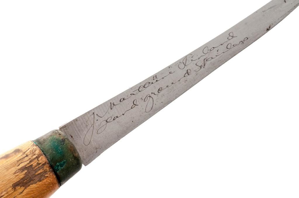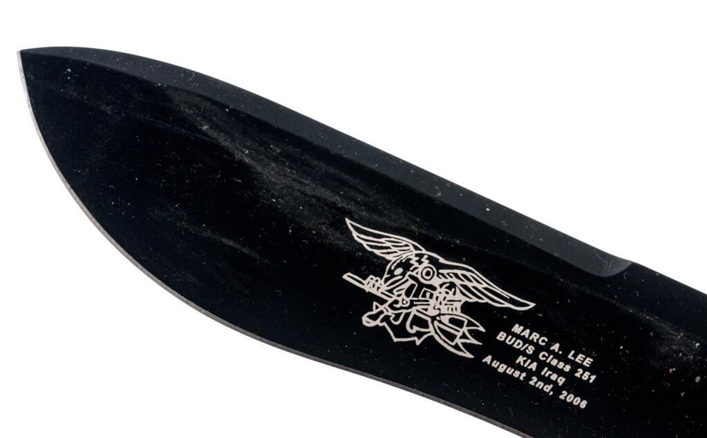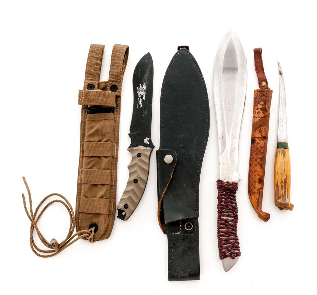 Lot of Three (3) Fixed Blade Knives: 1.) Benchmade Marc Lee "Glory" Knife with sheath. Made by Benchmade to honor Marc. A. Lee who was the first Navy Seal killed in Iraq since the beginning of the war in 2003. Knife features a 7-1/4" blade, black finish with G10 handle, in Molle compatible sheath. Condition is near excellent with light scuffs to matte finish blade. 2.) J. Marttiini, Finland, hand-ground stainless filet knife. in original brown leather sheath. 6-1/4" blade, 10-3/4" overall. In fair used condition. Handle shows flaking and finish wear. Blade with surface rust near the tip. 3.) Blackjack Knives Simba bolo knife, in black leather sheath. 11" double-edged blade, 17-3/4" overall, rubber handle was removed and is now wrapped with paracord. In fair used condition, with general light scratches and mild oxidation on the blade, should improve with a thorough cleaning. There are a few chips to the cutting edge. Est.: $250-$400/Lot.
