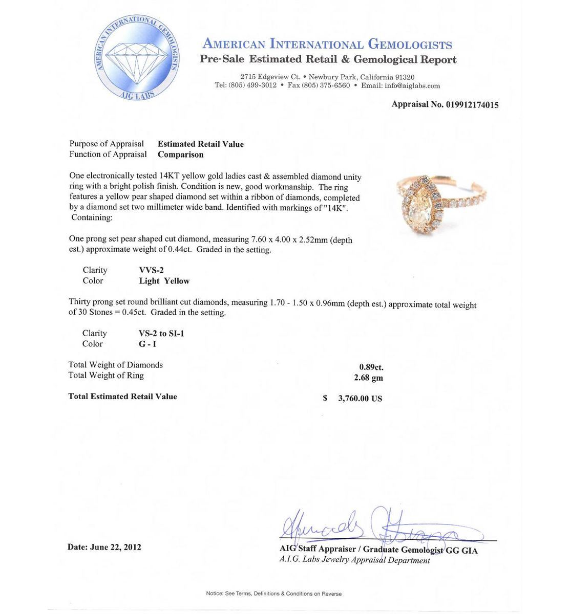 14KT Yellow Gold 0.89ctw Diamond Unity Ring A4071. Excellent Condition! UX6051SY. One electronically tested 14KT yellow gold ladies cast & assembled diamond unity ring with a bright polish finish. Condition is new, good workmanship. The ring features a yellow pear shaped diamond set within a ribbon of diamonds, completed by a diamond set two millimeter wide band. Identified with markings of "14K". Containing: One prong set round brilliant cut diamonds, measuring 7.60 - 4.00 x 2.52mm (depth est.) approximate weight of 0.44ct. Graded in the setting. Clarity: VVS-2. Color: Light Yellow. Thirty prong set round brilliant cut diamonds, measuring 1.70 - 1.50 x 0.96mm (Depth est.) approximate total weight of 30 Stones = 0.45ct. Graded in the setting. Clarity: VS-2 to SI-2 to SI-1. Total Weigh of Diamonds: 0.89ct. Total Weight of Ring: 2.68gm. AIG appraised at $3,760.00.