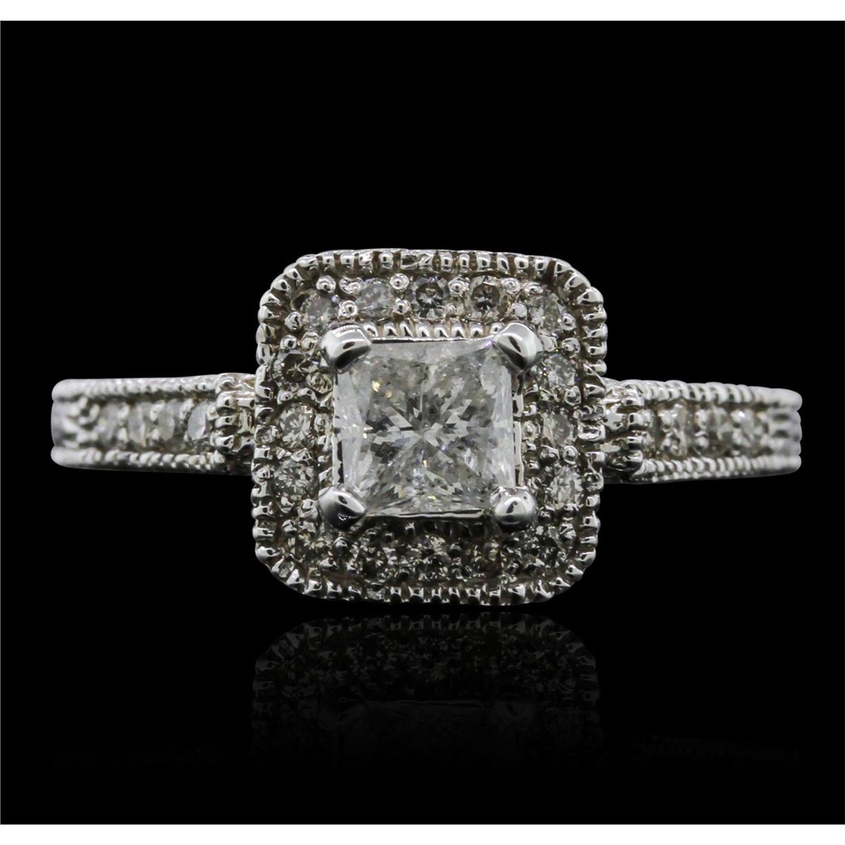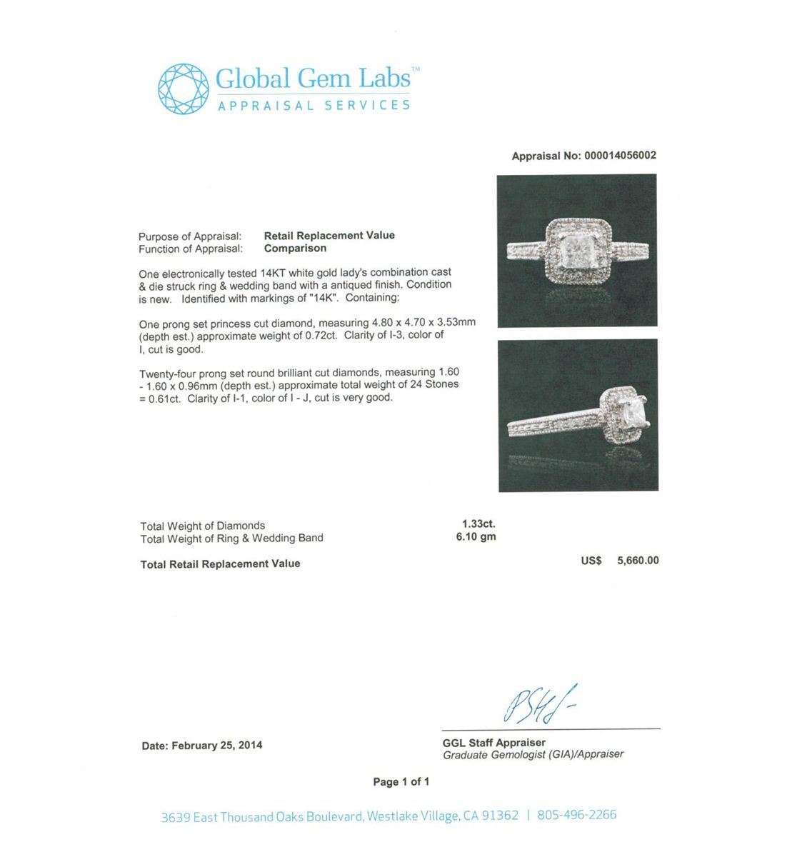 14KT White Gold 1.33ctw Diamond Ring A7882. New Condition! RG6151GB. One electronically tested 14KT white gold lady's combination cast & die struck ring & wedding band with a antiqued finish. Condition is new. Identified with markings of "14K". Containing: One prong set princess cut diamond, measuring 4.80 x 4.70 x 3.53mm (depth est.) approximate weight of 0.72ct. Clarity of I-3, Color of I, Cut is Good. Twenty-Four prong set round brilliant cut diamonds, measuring 1.60 - 1.60 x 0.96mm (depth est.) approximate total weight of 24 Stones = 0.61ct. Clarity of I-1, Color of I - J, Cut is Very Good. Total Weight of Diamonds 1.33ct. Total Weight of Ring & Wedding Band 6.10gm. GGL Appraised at $5,660.00.