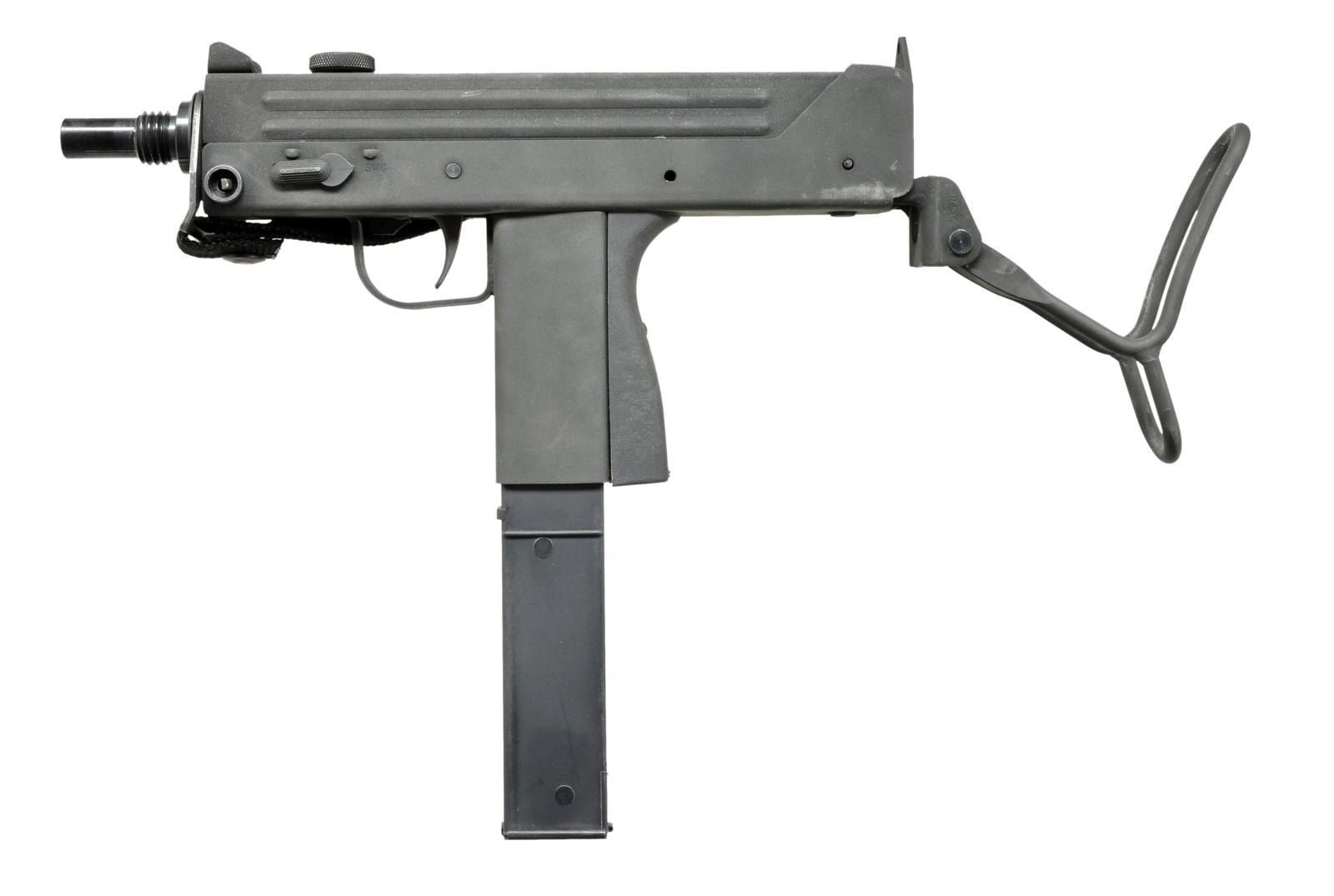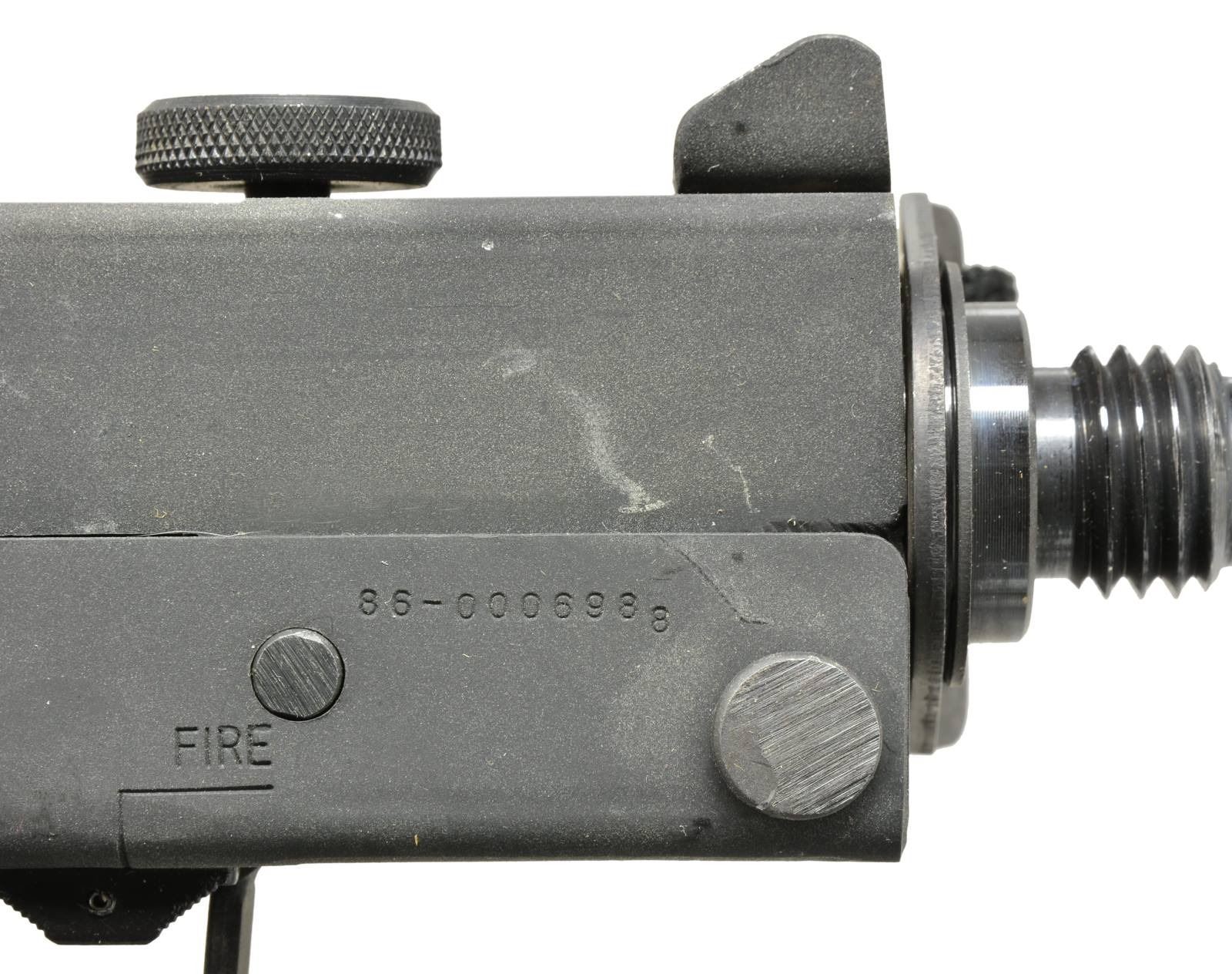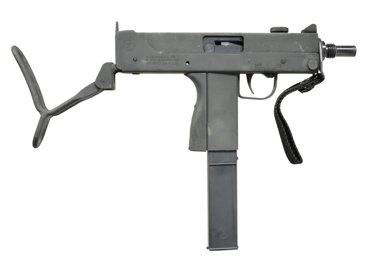 Cal. 9mm. S# 86-0006988. Bbl. 5.5". The younger brother of the infamous MAC-10 may not have moved out of its shadow as far as Hollywood movies & urban legend is concerned, but as far as becoming a commonly owned civilian SMG, it may actually have taken the top spot. From its introduction to the legislative imposed cutoff of 05-19-1986 the M-11 was a popular & affordable entry level SMG. Its low price was only rivaled by its reliability & these little bullet hoses continue to perform just as well several decades later. This particular example mfg. by SWD of Atlanta GA was mfg. during the final year. The company name was an acronym for Silvia Williams Daniel, the prior spouse of Wayne Daniel who owned the manufacturing rights to the Ingram Model 11 as well as the popular Cobray trademark. Finish on exposed metal surfaces is dark & parkerized. The protected post fixed front sight & single aperture rear sight were sufficient for the extremely fast cyclic rate & aided by a top folding telescoping wire stock. Factory threaded bbl. Left side selector switch. Right side safety parallel to trigger guard. The familiar Cobray snake logo appears on the right rear of the lower receiver. Open bolt select fire action. MAGS: 1-30 rd. Zytel Cobray factory. UNATTACHED ACCESSORIES: factory cardboard shipping box w/ fitted Styrofoam insert; 1 Cobray mag. loading tool & factory cleaning rod. CONDITION: finish on exterior metal surfaces enjoys complete coverage w/ only light scratches which are common when storing these in multiple. Gun is devoid of finish thinning even in areas of mechanical intervention indicating that it has been used very little beyond test firing if at all. Bore is shiny w/ strong rifling. Fire control mechanism appears to function correctly when cycled by hand. NATIONAL FIREARMS ACT SMG REQUIRING BATF TRANSFER BEFORE TAKING POSSESSION. FULLY TRANSFERABLE. (03-1504/JZ). MODERN CLASS III. $3,500-4,500