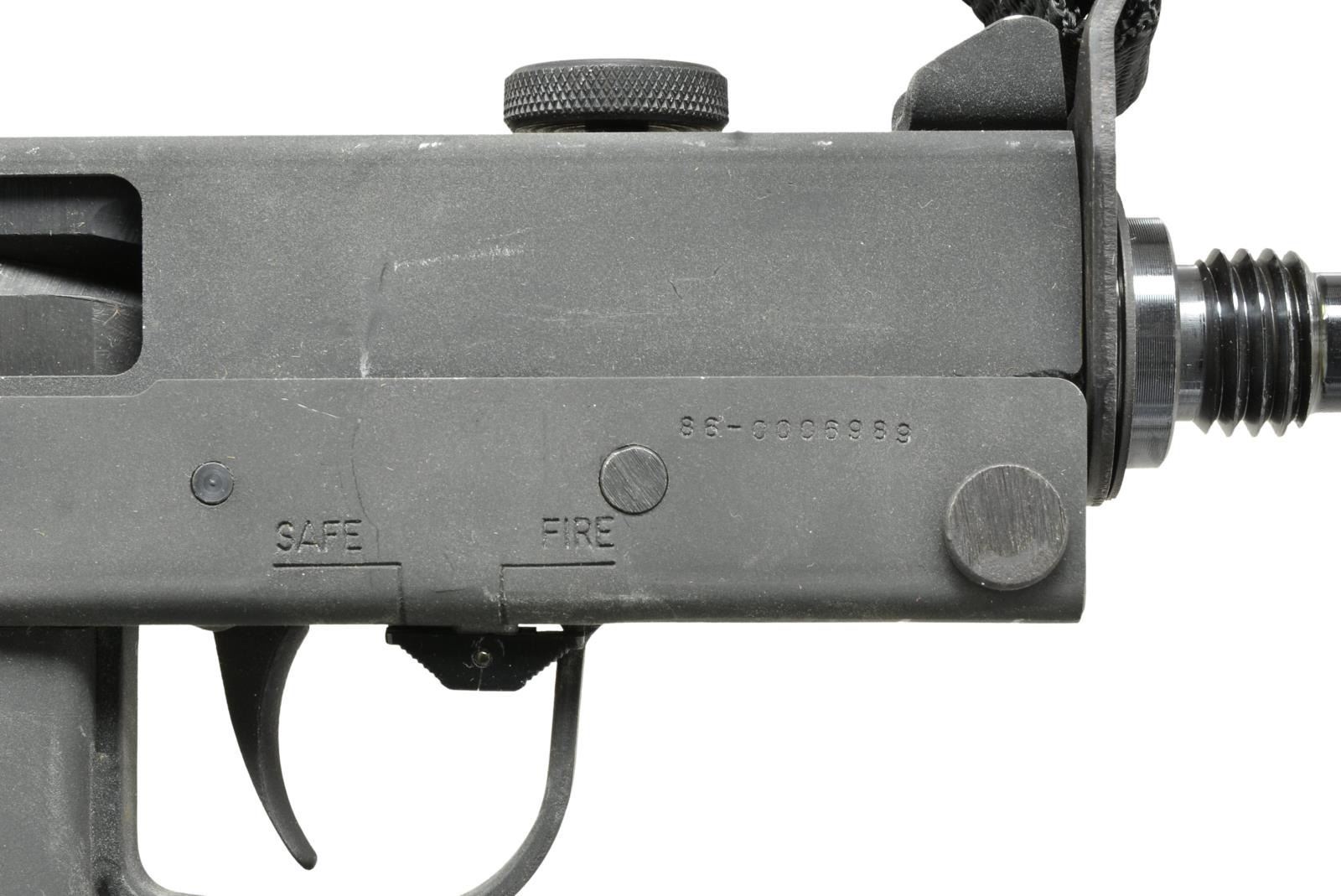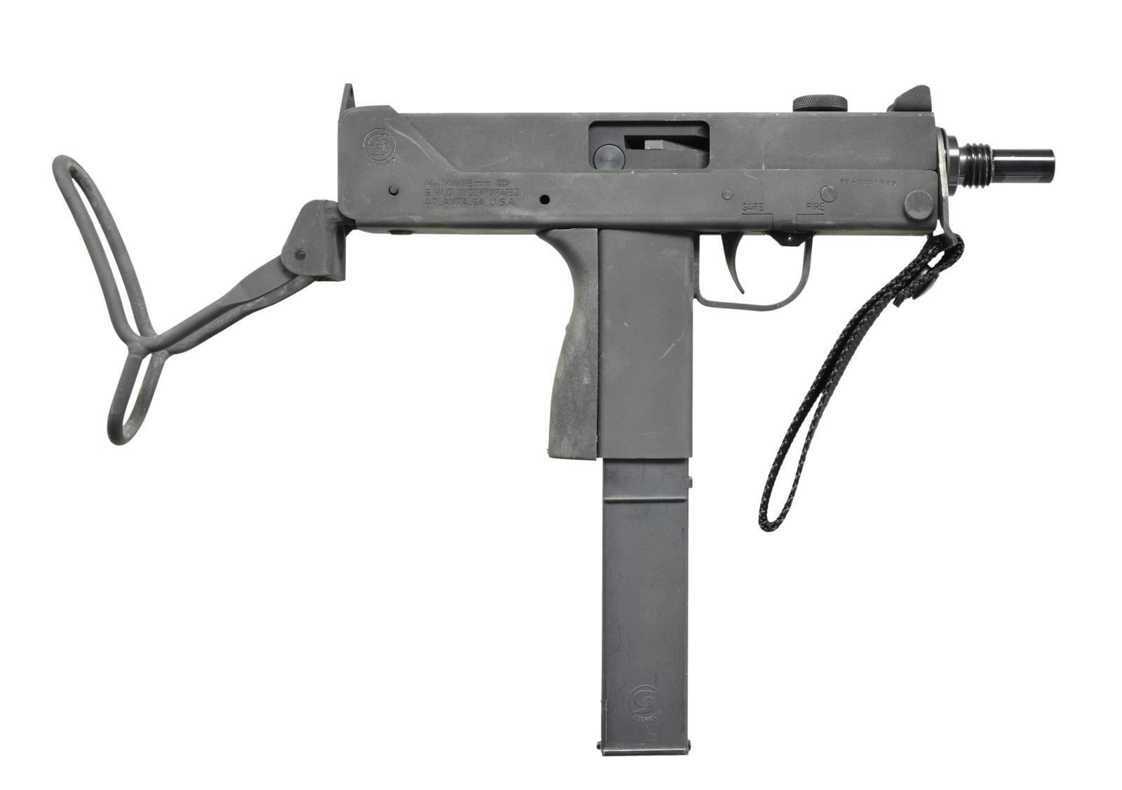 Cal. 9mm. S# 86-0006989. Bbl. 5.5". The younger brother of the infamous MAC-10 may not have moved out of its shadow as far as Hollywood movies & urban legend is concerned, but as far as becoming a commonly owned civilian SMG, it may actually have taken the top spot. From its introduction to the legislative imposed cutoff of 05-19-1986 the M-11 was a popular & affordable entry level SMG. Its low price was only rivaled by its reliability & these little bullet hoses continue to perform just as well several decades later. This particular example mfg. by SWD of Atlanta GA was mfg. during the final year. The company name was an acronym for Silvia Williams Daniel, the prior spouse of Wayne Daniel who owned the manufacturing rights to the Ingram Model 11 as well as the popular Cobray trademark. Finish on exposed metal surfaces is dark & parkerized. The protected post fixed front sight & single aperture rear sight were sufficient for the extremely fast cyclic rate & aided by a top folding telescoping wire stock. Factory threaded bbl. Left side selector switch. Right side safety parallel to trigger guard. The familiar Cobray snake logo appears on the right rear of the lower receiver. Open bolt select fire action. MAGS: 1-30 rd. Zytel Cobray factory. UNATTACHED ACCESSORIES: factory cardboard shipping box w/ fitted Styrofoam insert; 1 Cobray mag. loading tool & factory cleaning rod. CONDITION: finish on exterior metal surfaces enjoys complete coverage w/ only light scratches which are common when storing these in multiple. Gun is devoid of finish thinning even in areas of mechanical intervention indicating that it has been used very little beyond test firing if at all. Bore is shiny w/ strong rifling. Fire control mechanism appears to function correctly when cycled by hand. NATIONAL FIREARMS ACT SMG REQUIRING BATF TRANSFER BEFORE TAKING POSSESSION. FULLY TRANSFERABLE. (03-1505/JZ). MODERN CLASS III. $3,500-4,500.