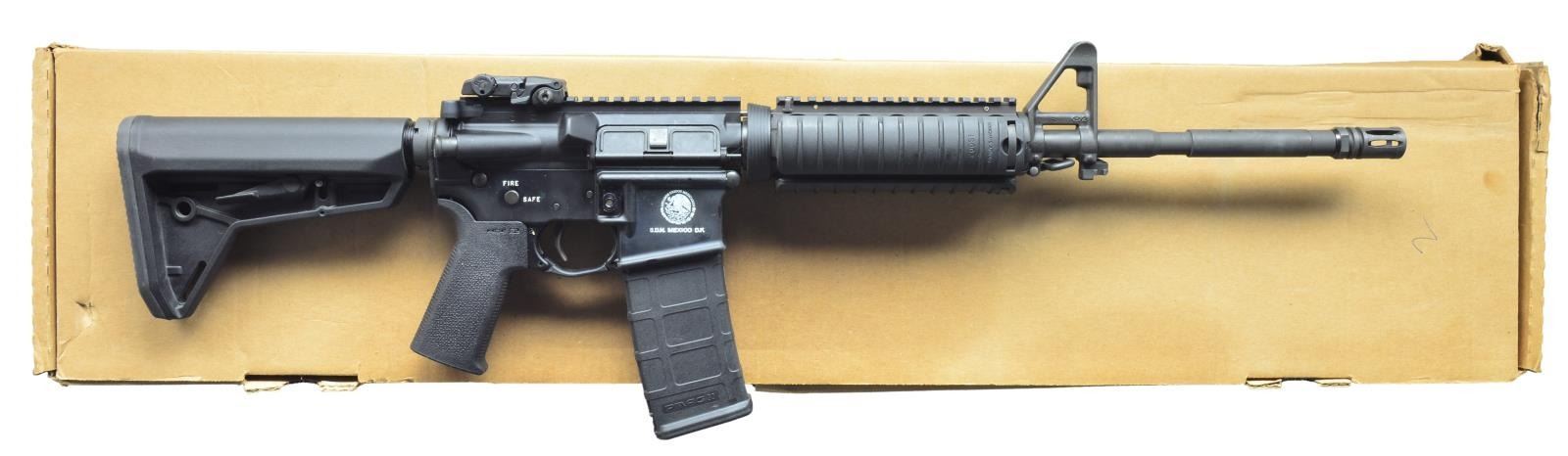 Cal.5.56 MM. S# LE344891. Bbl. 16". Extremely rare Colt LE6920 M4 Carbine mfg. for the Mexico Distrito Federal. Though occasionally a rare example will hit the market w/ the roll mark "S.D.N. MEXICO D.F." (Secretaria de la Defensa Nacional of Mexico) on the right side magwell, this rare example is engraved "Estados Unidos Mexicanos" w/ Mexican National Coat of Arms. It is believed that the guns w/ the COA were mfg. by Colt as sales samples for the Mexican Government. The factory box designates it as LE6920 MP. Magpul MOE SL 4-position collapsible stock & matching stippled MOE SL pistol grip. 16" M4 profile bbl. marked "13629 MP"/ "5.56 NATO 1/7" terminated w/ threaded muzzle & A2 flash hider. Protected post front sight/ gas block/ bayonet lug assembly properly retain Knight's Armament quad rail system w/ slip over covers. Flat top upper receiver w/ brass deflector & rnd. forward assist host Magpul MBUS rear flip up adj. sight. Lower receiver marked on left side w/ Colt logo above "M4 CARBINE"/ "CAL. 5.56MM" & S# on magwell. Markings above trigger include "COLT DEFENSE"/ "HARTFORD CONN."/ "U.S.A.". Safety selector marked "Safe/ Fire" on both sides of receiver, though controls are located on the left. There are a few different stories about the market availability of these particular rifles that range from contracts undelivered to contract returns w/ a few different quantities originally mfg., but one thing we know for certain is the rifle's engraved w/ the Mexico National Coat of Arms is extremely rare. Matching dark black finish on all exposed metal surfaces w/ all engraving highlighted white. MAGS: 2 PMAG 30 rd. as shipped from Colt. UNATTACHED ACCESSORIES: unopened armorer's/ maintenance kit including sling, cleaning supplies, lock & Spanish language owners manual. Sealed, fired, test casing. Colt factory cardboard shipping box. CONDITION: all outward appearances indicate new, unfired. Still retains plastic chamber flag & received in clear plastic coated shipping bag. Bore is shiny w/ excellent rifling & fire control mechanism appears to function correctly when cycled by hand. (21-923/JZ). MODERN. $2,000-3,000.