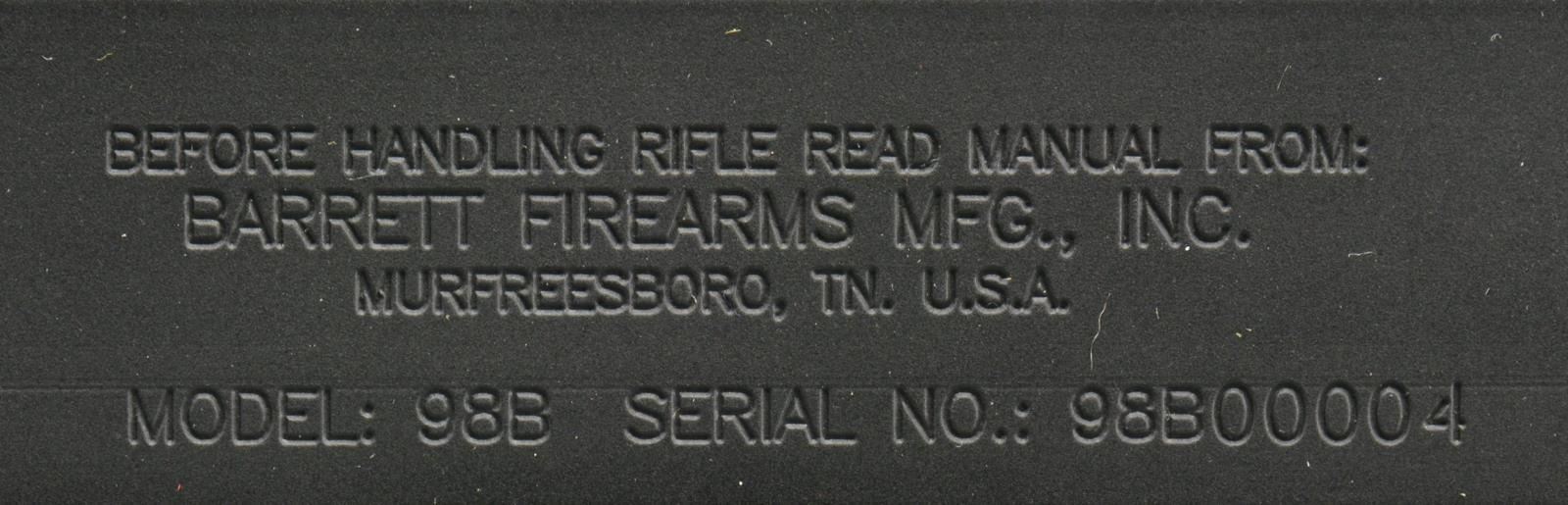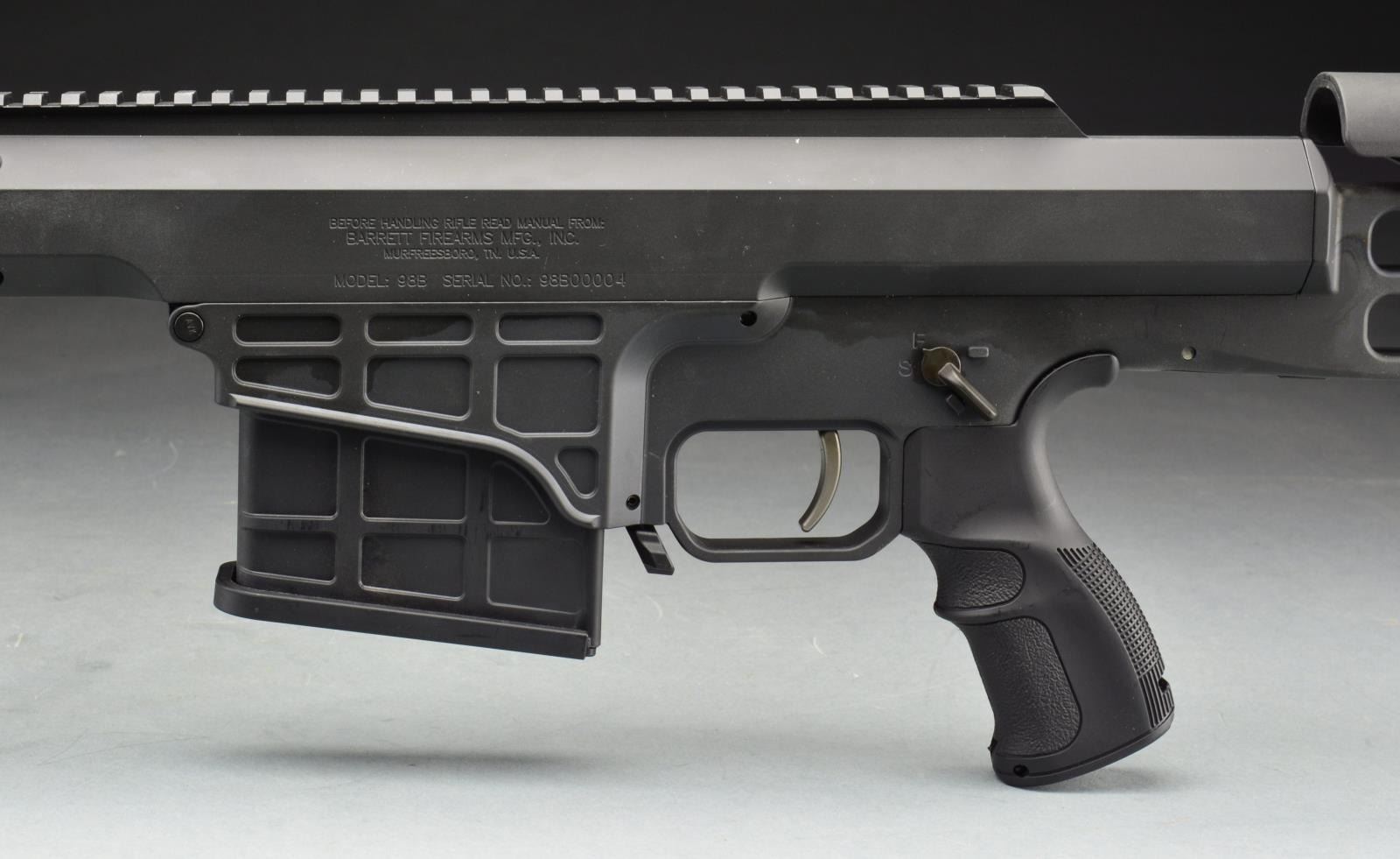 Cal. 338 Lapua Mag. S# 98B00004. Bbl. 27". Barrett Firearms is absolutely best known for their extremely high quality 50 BMG platforms however that is a long distance from where their innovation stops. W/ numerous other offerings, all tremendously well built, the focus of this particular exercise is to bridge the huge gap between an infantry-level load like the 5.56x45 MM or 7.62x51 NATO & the time honored & battle proven 50 BMG. While each have an area they excel in, the operational territory between the two is enormous. It would be extremely impractical & counter productive to issue a 50 BMG as a primary weapon & cal. but if a fair amount of longer-range work & at times fill an anti-material weapon role were possible w/ something that had a comparable weight & physical footprint w/ the current issued battle rifle then it may make sense. This is the role the Barrett M98B, chambered in .338 Lapua Mag was designed to fill. Weighing in at approximately 16 lbs. w/ its 1:10 rifled, fluted 27” bbl. & w/ a plethora of available ammunition options the 98B does just that. Utilizing an effective muzzle break design & well thought out stock this can be accomplished while keeping the recoil impulse to that of a 20 ga. shotgun. Feeding from a detachable box magazine allows mission specific ammunition to be called upon in an instant. The monolithic receiver assembly incorporates over 18" of picatinny rail to accommodate even the most technological load out. The distance capability of the system is immediately acknowledged w/ a 40 MOA adjustment built into the rail itself. Heat dissipation is addressed via 28 oval shaped cooling ports in the receiver over the breech area. Accessory rails may be added at 3/6/9:00 to suit any accessory necessity. The factory trigger is fully adj. & the owner’s manual details each adjustment making the procedure safe & easy. The shoulder stock w/ its soft rubber recoil pad utilizes a height adj. cheek piece to perfectly match shooter to the optics of choice. The pistol grip is checkered on the rear while inlet at the front w/ a stippled texture. The entire system is finished in a matching matte black color. Right side operated bolt action w/ manual reversible controls currently located on left side. Mag. release located at front of trigger guard. MAGS: 1 factory 10 rd. UNATTACHED ACCESSORIES: fitted Pelican transport case & factory owners manual. CONDITION: all aspects indicate extremely low usage if any any all. Exterior finish is complete & free of any noticeable blemishing. Telltale areas of normal usage such as debris buildup in muzzle brake chambers are absent. Finish wear on areas of mechanical intervention is also absent. Trigger is extremely light & crisp. Bore is shiny & strong rifling. (21-1589/JZ). MODERN. $3,000-4,000.