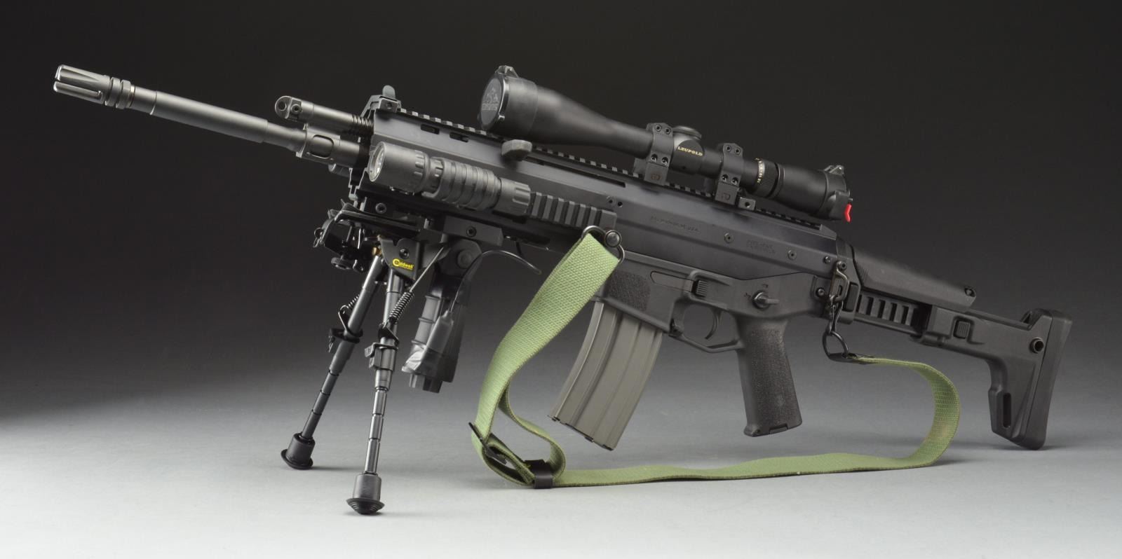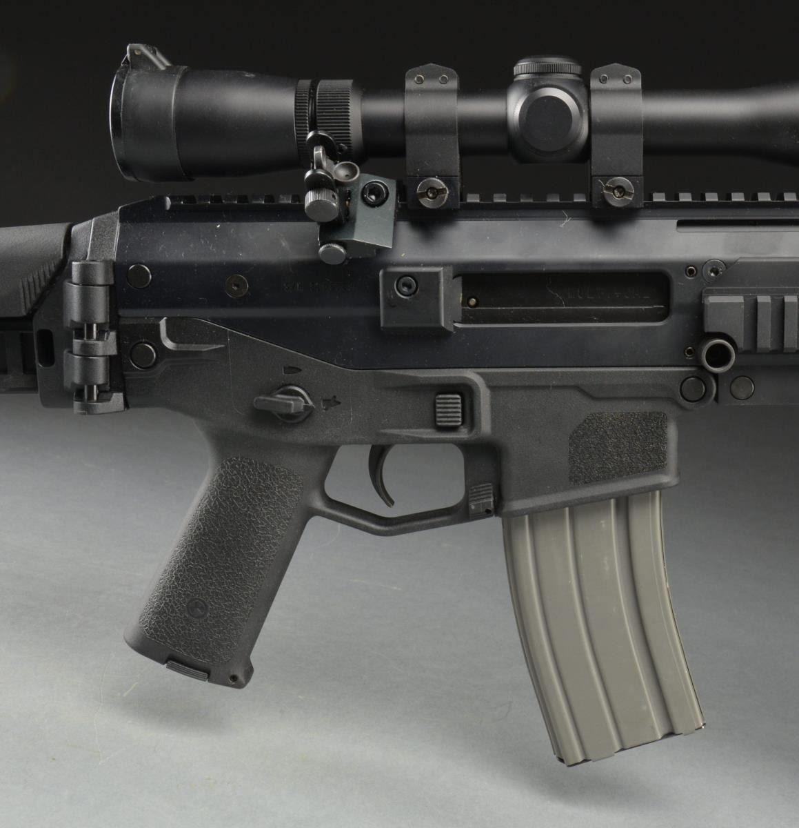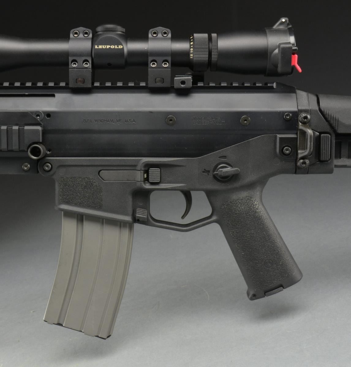 Cal. 5.56MM. S# BL05389. Bbl. 16.5". Bushmaster ACR (Advanced Combat Rifle) was an early entrant in what was to become “the next generation” of America’s primary service rifle to replace the long utilized M16 & its variants. There are actually only very few similarities to the M16, such as the rotating bolt system. The 16.5” bbl. has a 1:9 rate of twist & the exterior profile is very similar to the M4. Bbl. is terminated w/ a threaded muzzle & a proprietary brake vaguely resembling the Vortex type flash hider. Left side reciprocating charging handle. Adj. gas piston system is another step away from the long used direct gas impingement system. The upper receiver is a 1 piece monolithic design that incorporates over 16” of picatinny top rail mounting surface w/ additional rail surfaces at 3/6/9:00 for accessories. Lower receiver (which includes mag-well, trigger guard & pistol grip) is a black composite material roughly textured on both sides of pistol grip & mag-well. Ambidextrous mag release, bolt release, & safety/ selector. Pistol grip has a compartment to store 2-CR123 lithium batteries. Shoulder stock is a telescoping, collapsible & right side folding design which does not interfere w/ firing regardless of position. QD sockets for sling attachment located on both sides at center point of rifle & on rear stock. Matte black finish on all exposed surfaces. Currently sporting a Caldwell folding/telescoping bipod & UTG FVG below bbl. Unidentified weapon light mounted at 9:00 & green laser at 3:00. Leupold 4-12x40MM Rifleman scope w/ duplex crosshairs & flip up covers. Currently sporting 45 degree offset folding iron sights. Green canvas sling. MAGS: 1 aluminum 30 rd. CONDITION: finish on all exposed metal surfaces complete & consistent w/ no noticeable blemishing. Ejection port buffer illustrates fairly light usage. Laser & flashlight appear functional. Scope glass & reticle appear clear. Shiny bore w/ aggressive rifling. Safety/ selector appears to float w/out positively locking in to any position & otherwise fire control mechanism appears to function correctly when cycled by hand. (21-1507/JZ). MODERN. $800-1,200.