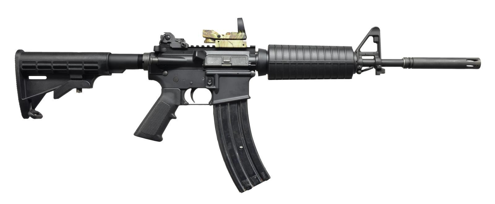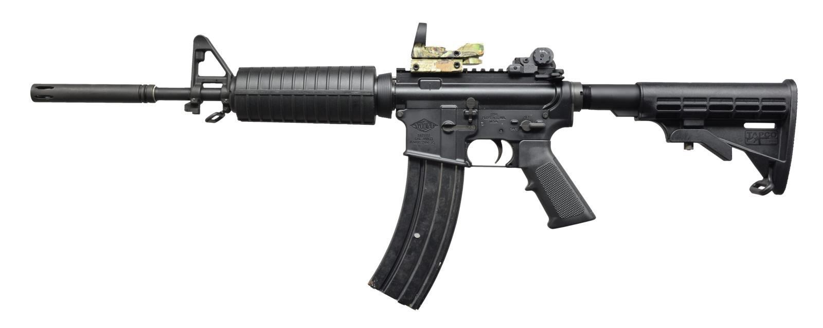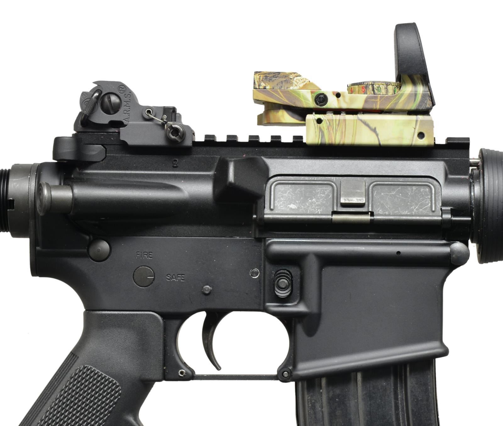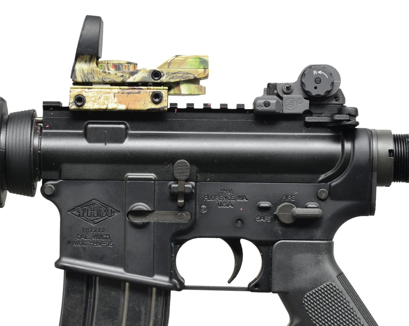 BRAKE. Cal. 223 Rem. S# YH2222. Bbl. 11 1/2" w/ permanently attached 5 1/2" muzzle brake. YHM carbine in an early commando configuration. Though it utilizes an 11 1/2" bbl. like the original, it has a permanently attached muzzle brake which appears to be blind pinned & welded, keeping the overall length in the title 1 category. Dark black finish on both receivers. Traditional tall protected post front sight/bayonet lug/gas block combo w/ front sling swivel. Flat top keystone upper receiver w/ brass deflector & rnd. forward assist. ARMS BUIS folding sight which appears to be regulated w/ a TruGlo red/green dot reflex style sight. 6 Position collapsible Tapco shoulder stock w/ rear sling swivel. SP1 cut style bolt carrier. MAGS: 1-40 rd. CONDITION: finish coverage is complete on all exposed metal surfaces, no external blemishing visible on metal or stocks, TruGlo sight appears to function correctly, bright bore w/ decent rifling. Fire control mechanism appears to function correctly when cycled by hand. (21-460/JZ). MODERN. $600-900.