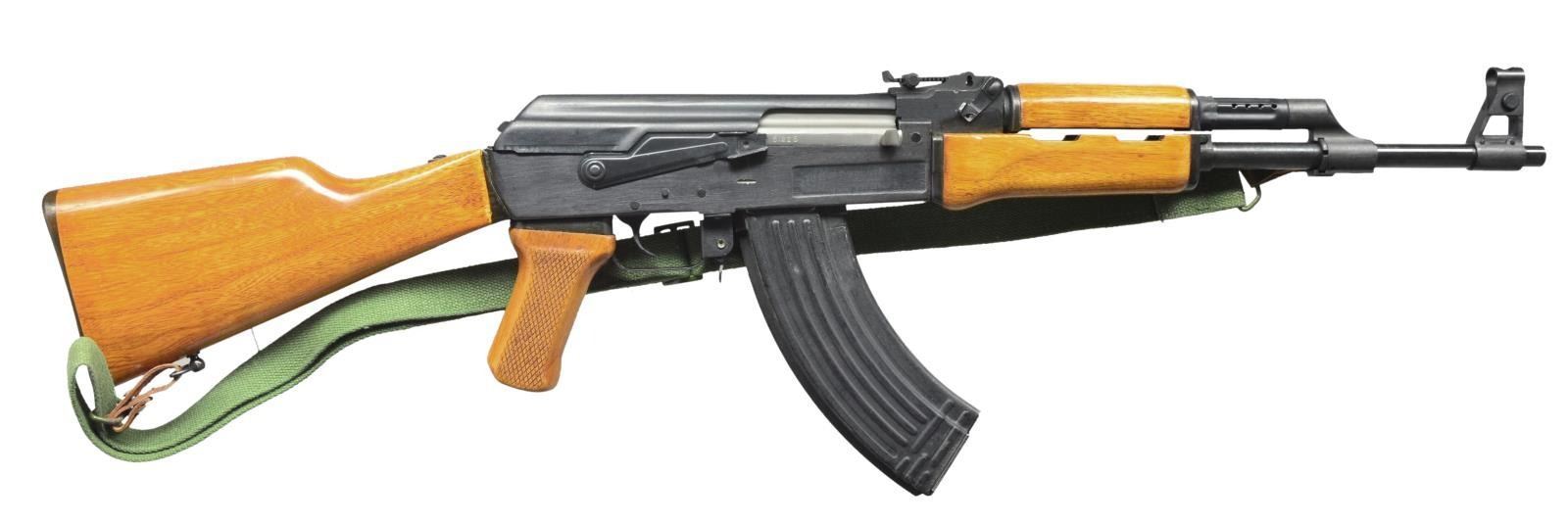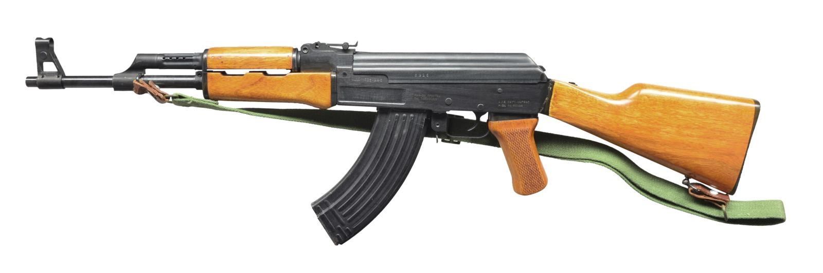 Cal. 7.62X39. S# 9351225. Bbl. 16". Norinco AK-47 variant imported from Norinco, China through A.C.C. INT' L INTRAC. Blued finish on exposed metal surfaces. Unmarked front trunnion. Import markings on left side of receiver. Marked on receiver bottom "MADE IN CHINA" w/ familiar Norinco logo. Oval 386 factory code. Yellow tinted wooden furniture w/ hand checkered pistol grip. Milled receiver w/ shallow lightening cuts above trunnion & magwell. Unthreaded muzzle in front of hooded post front sight. No bayonet lug. Tangent rear sight marked to 800 meters. Right side controls. Matching numbers on several sm. parts & receiver. Left side sling mounts currently sporting green canvas sling. MAGS: 1 metal 30 rd. CONDITION: exterior surfaces still retain the vast majority of their original finish. Some areas of thinning on receiver due to mechanical intervention w/ safety selector. Wood furniture appears free of any noticeable blemishing beyond normal impressions. Shiny bore w/ strong rifling. Fire control mechanism appears to function correctly when cycled by hand. (21-1451/JZ). MODERN. $700-1,100.