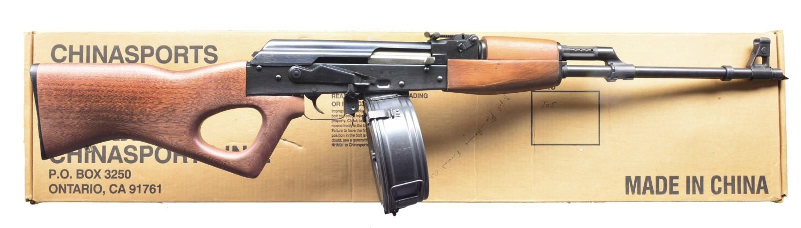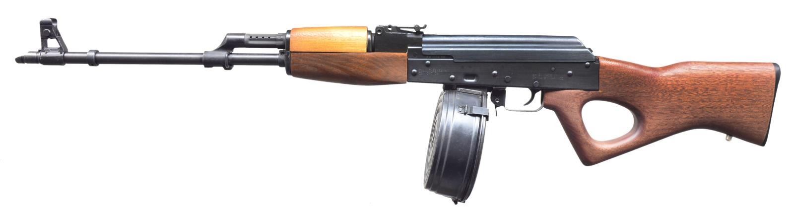 Cal. 7.62x39. S# 9211283. Bbl. 21". The NHM91 was a very early offering into the transitional period beginning in the late 1980s where imported firearms had to be suitable as “sporting” & not fall under a new criteria & considered assault weapon. Of course, by 1994 the same criteria effected domestic mfg. as well as imported offerings & eventually sunset 10 years later. Unfortunately, the country of origin & political current events still influences importability. The NHM91 was the new model previously known as the RPK w/ its physical characteristics altered just a little. Hardwood forend & thumbhole pistol grip shoulder stock. Factory bluing on all exposed metal surfaces. Bbl. terminated w/ M14x1 LH threads & proper slant muzzle brake. Protected post front sight & rear tangent sight marked to 800m w/ a radius of almost 20". No bayonet lug. Bipod is present but hasn’t been assembled on rifle. Factory built by Norinco in China, imported through CSI in California. Right side controls. MAGS: 2 TOTAL; 1-5 rd. mag., 1-75 rd. Chinese triangle 36 rear loading drum. UNATTACHED ACCESSORIES: factory cardboard box, owner’s manual for drum & rifle, factory bipod, cleaning rod, black nylon sling, oil bottle. CONDITION: wood is free of any major impression or blemishing. Exposed metal surface finish is consistent & complete. Receiver area between or below safety is only marred w/ a thin line, illustrating light use. A few light scratches typically associated w/ vertical storage. Bore is shiny w/ strong rifling. Fire control mechanism appears to function correctly when cycled by hand. (21-732/JZ). MODERN. $500-800.