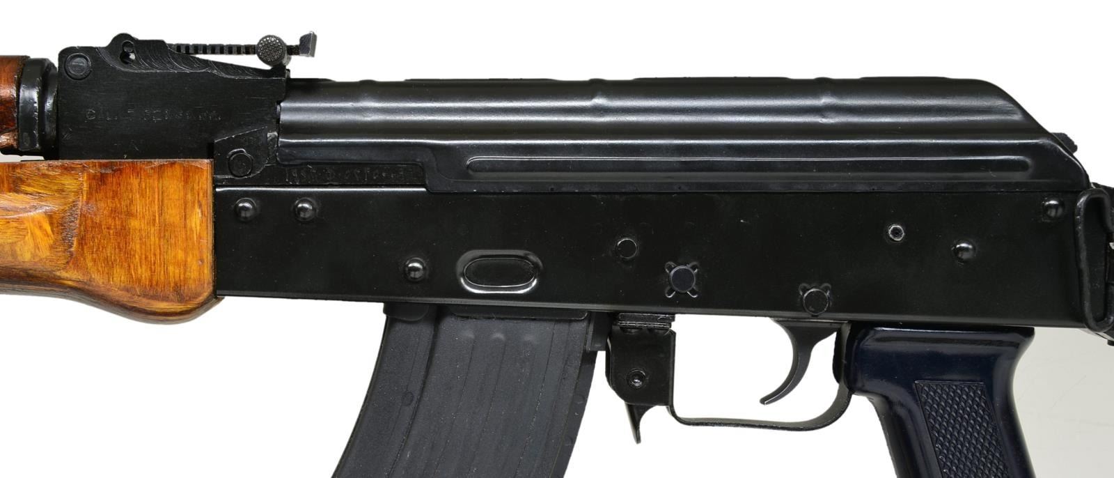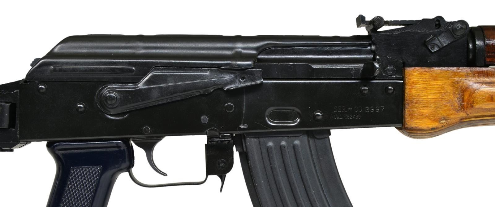 Cal. 7.63x39. S# CC3997. Bbl. 16". An Egyptian MAADI AK47 variant built on an Elk River stamped receiver w/ right side folding wire stock. Characteristic satin black finish on all exposed metal surfaces. Left hand threaded muzzle w/ Tapco USA slant brake. Protected post front sight & bayonet lug play host to onboard cleaning rod. Signature MAADI orange tinted laminated wood furniture. Black plastic pistol grip. Rear tangent sight elevation adj. to 1000m. Left side sling swivel front & rear. MAGS: 1-30 rd. metal. UNATTACHED ACCESSORIES: VSIM nylon transport bag. CONDITION: black painted finish complete & consistent on all exposed metal surfaces laminated forend has what appears to be a hairline crack following the laminated grain toward the center. Stock locks tightly in both open & closed positions. Finish surface between selector & receiver is only gently thinning, illustrating very little use. Clean bore w/ well pronounced rifling. Fire control mechanism appears to function correctly when cycled by hand. (21-780/JZ). MODERN. $600-900.