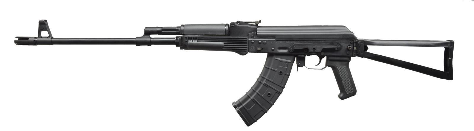 Cal. 7.62x39. S# A10130894. Bbl. 23 1/2" over muzzle device. This rifle may be as close to an authentic AK47 variant as possible. Mfg. in Russia by Izhmash. The Saiga side folder imported through AQUILA ARMS LLC in FL. is even chambered in the traditional 7.62x39mm rd. Dark black finish on all exposed metal surfaces. Protected post front sight behind what appears to be a permanently affixed muzzle device. Mfg. by Krebs Custom Guns. No bayonet lug. Tangent style rear sight marked to 300m. Left side scope mount on reinforced stamped receiver w/ right side controls. Triangular left side folding stock. US made black plastic AK forend pieces. Sling mounting on left side. MAGS: 1-30 rd. PufGun plastic mag. UNATTACHED ACCESSORIES: factory Izhmash cardboard shipping box. CONDITION: all outward appearances indicate this rifle has seen extremely low use if any at all. Area of receiver that coincides w/ safety selector only has a light scratch beneath it which often happens w/ in the first few times it is engaged. Folding stock locks tightly in both open & closed positions. Shiny bore w/ well pronounced rifling. Fire control mechanism appears to function correctly when cycled by hand. (21-739/JZ). MODERN. $500-800.