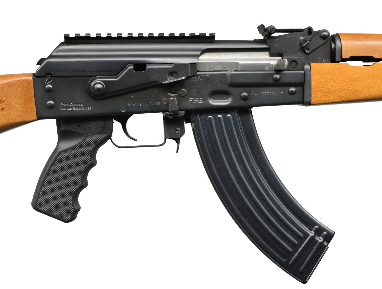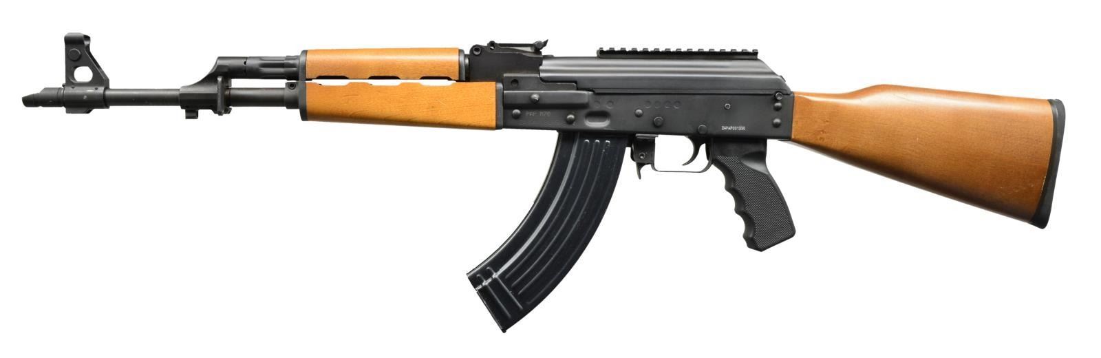 Cal. 7.62x39. S# ZAPAP001220. Bbl. 16”. Serbian sporting rifle variant of the popular AK-47. Hardwood furniture. Black painted finish on all exposed metal surfaces. Protected post front sight. Tangent style rear sight graduated to 1,000 meters. 5.75" Picatinny rail fixed to top cover. Plastic pistol grip. Sling swivel on left side of gas block. Import marked “C.A.I. GEORGIA” on right side of receiver. Permanently attached slanted muzzle brake. Lever actuated bolt hold open device. MAGS: 1-30 rd. metal. CONDITION: bbl. shows a few minor handling marks. Left side of stock at toe shows series of sm. compression marks. Remainder of exterior appears to be well maintained. Bore has strong rifling w/ areas of light pitting in grooves. Action appears to function correctly when cycled by hand. (20-360/JZ). MODERN. $500-800.