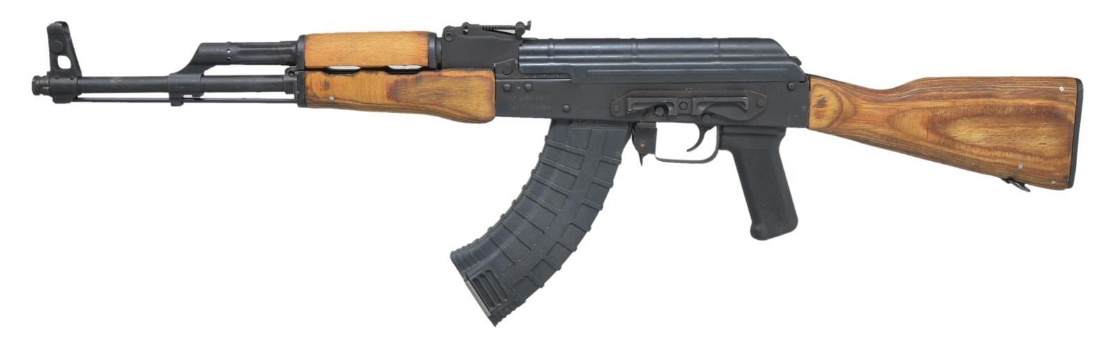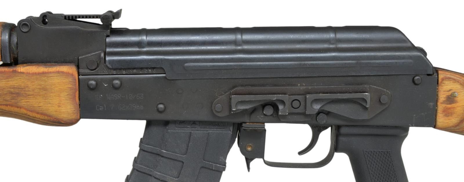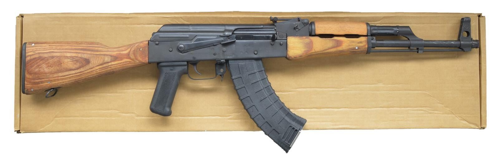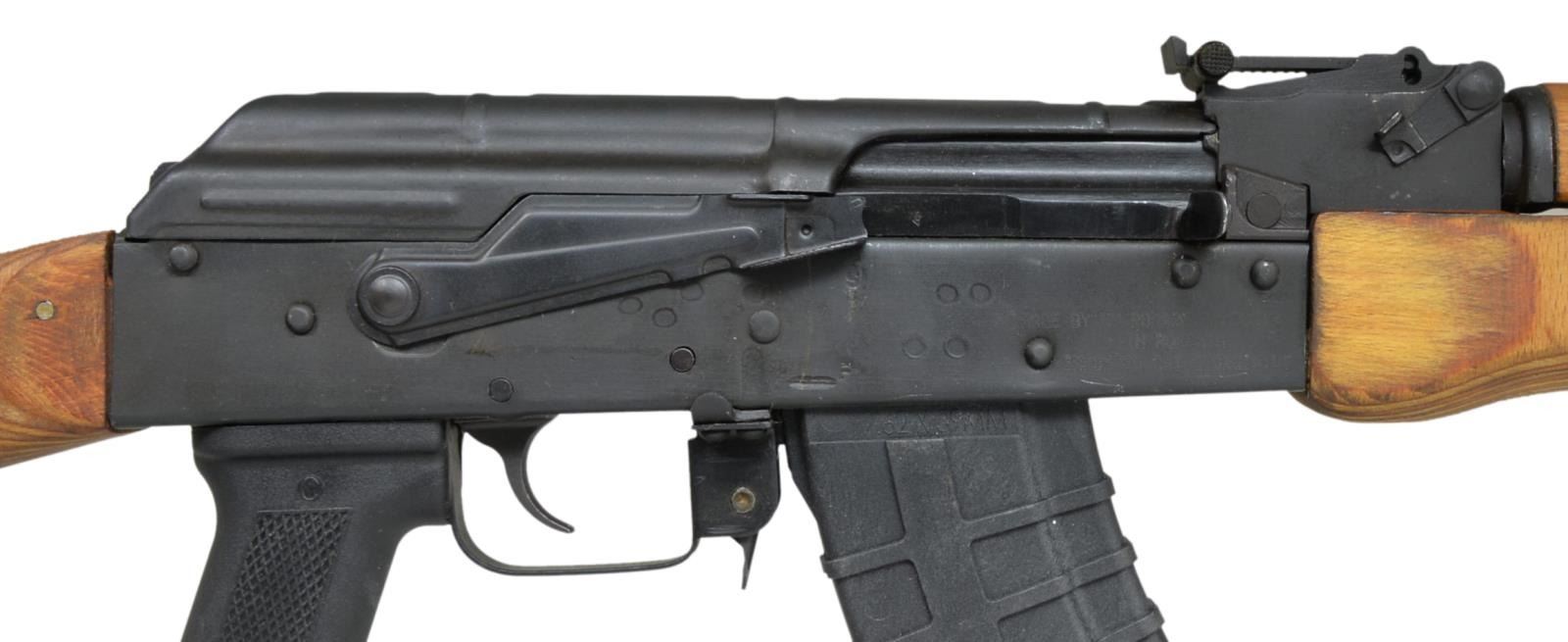 Cal. 7.62x39. S# 1979KE2896. Bbl. 16". Romanian AK47 variant as imported through CAI in Georgia, VT. Thread protector in place over muzzle. Spring detention pin appears permanent, in front of protected post front sight, on board cleaning rod supported w/ neutered bayonet lug. Rear sight adj. from 200-1000m. Black matte finish on all exposed metal surfaces. Left side original style scope mount. Correct laminated wood furniture w/ black plastic pistol grip & Tapco trigger. MAGS: 1-30 rd. Tapco. UNATTACHED ACCESSORIES: factory box, paperwork, cleaning kit, leather sling. CONDITION: original flat black metal finish is complete & consistent, some light thinning on bbl. typically associated w/ rack storage. Only significate finish wear on receiver is at junction of safety/selector. It doesn’t appear that this firearm has seen much use. Bore is shiny w/ strong rifling. Fire control mechanism appears to function correctly when cycled by hand. (21-554/JZ). MODERN. $400-600.