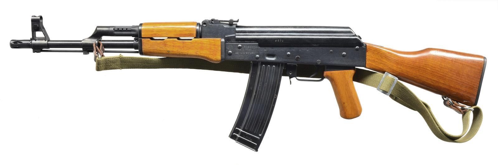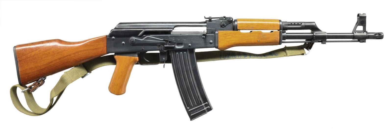 Cal. 5.56. S# 405890. Bbl.16". An early 5.56 semi-auto AK-47 variant imported from China through CSI in Las Angeles, CA. Blued finish on exposed metal surfaces. Front trunnion marked "82S" along w/ the triangle 66 Arsenal mark. Import markings on left side of receiver. Correct yellow/red tinted wooden furniture & reinforced stamped receiver. Slotted muzzle break in front of hooded post front sight. Gas block/bayonet lug play host to onboard cleaning rod. Tangent rear sight marked to 800m. Right side controls. Trap door buttstock includes cleaning kit remainder. Left side green canvas sling. Matching numbers on several sm. parts & receiver. MAGS:1 metal 30 rd. CONDITION: exterior surfaces still retain the vast majority of their original finish. Some thinning on high spots & in the area of receiver & selector where a fine line wears almost immediately to due mechanical intervention. Wood has normal impressions that are typical for this era of firearms. Bright bore w/ strong rifling. Fire control mechanism appears to function correctly when cycled by hand. (21-1448/JZ). MODERN. $800-1,200.