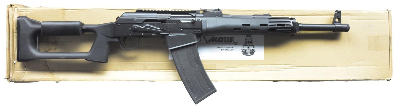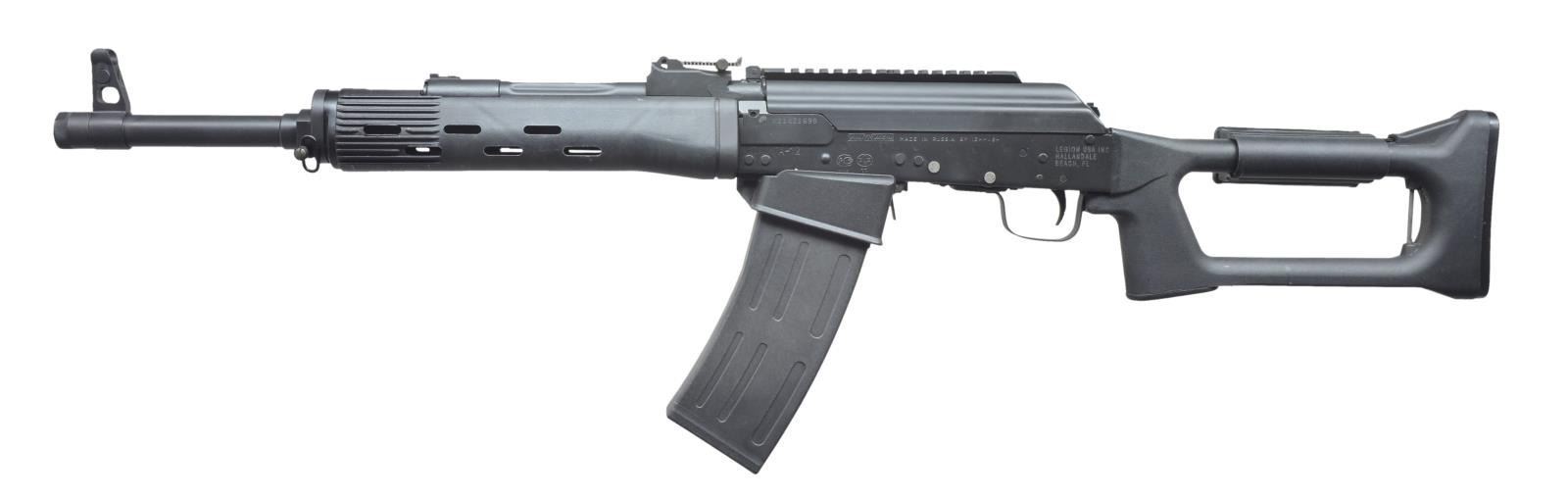 VEPR MAG. WELL. Cal. 12 Ga. S# X11421699. Bbl. 19". The Saiga-12, as w/ its close relative the VEPR-12, have become extremely desirable shotguns, especially since halting sales from Russia. This particular version, imported through Legion USA may arguably be the best of both platforms. A true Saiga-12 mfg. by Izhmash that is modified to utilize the popular VEPR-12 mag. The 19" bbl. is terminated w/ right hand exterior threads & thread protector. The front sight is a traditional protected post at the end of the muzzle. Rear sight w/ a radius of 17" is a tangent style marked to 1000m. Circular white dot inserts on front post & in rear blade, filled w/ luminescent paint. Hinged top cover provides 7" of picatinny rail real estate. Right hand controls. Black plastic furniture set up for sling mounting on left side. Factory finish on exposed metal surfaces is a dark black. Fire arm appears unmolested by 922r standards & still retains the traditional rearward trigger placement, as well as a skeletonized stock, somewhat resembling the Draganov w/ a more VEPR style adj. cheek piece. Forend is similar in design to the Dragonov, over 10" in length w/ cylindrical cooling slots cut out in bbl. section. MAGS: 1-10 rd. & 1-5 rd. UNATTACHED ACCESSORIES: cleaning kit, cleaning rod, factory literature, factory cardboard shipping box. CONDITION: all outward appearances indicate this firearm has not been utilized beyond factory test firing. Receiver finish below safety has yet to earn a scratch, indicating very low usage. Mirror bright bore. Fire control mechanism appears to function correctly when cycled by hand. (21-736/JZ). MODERN. $500-800.