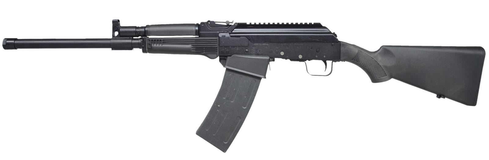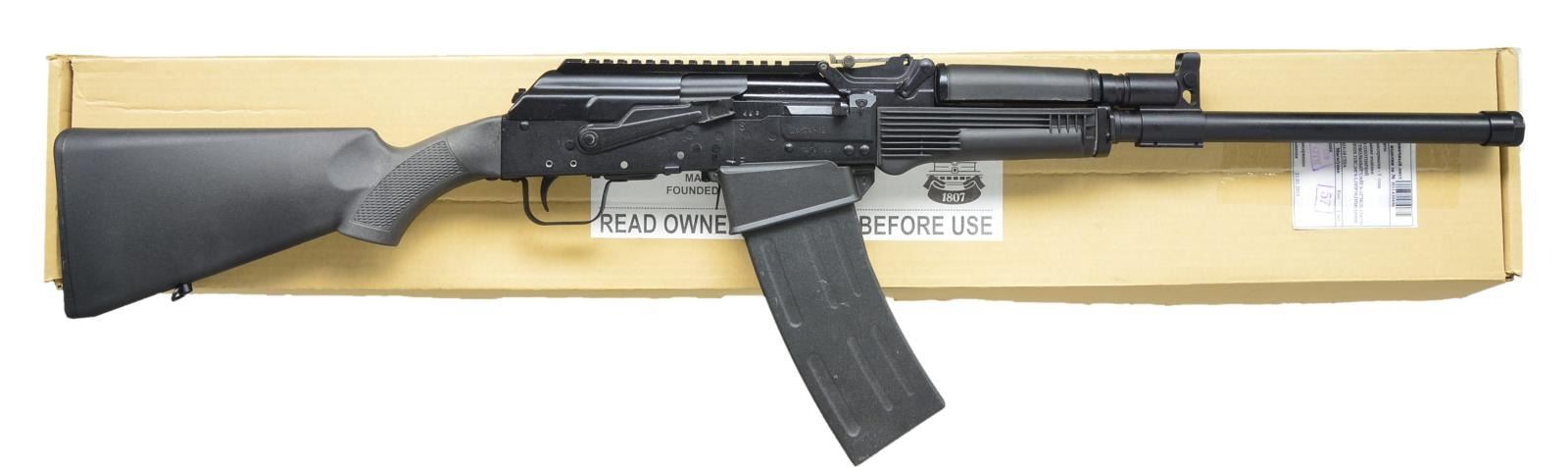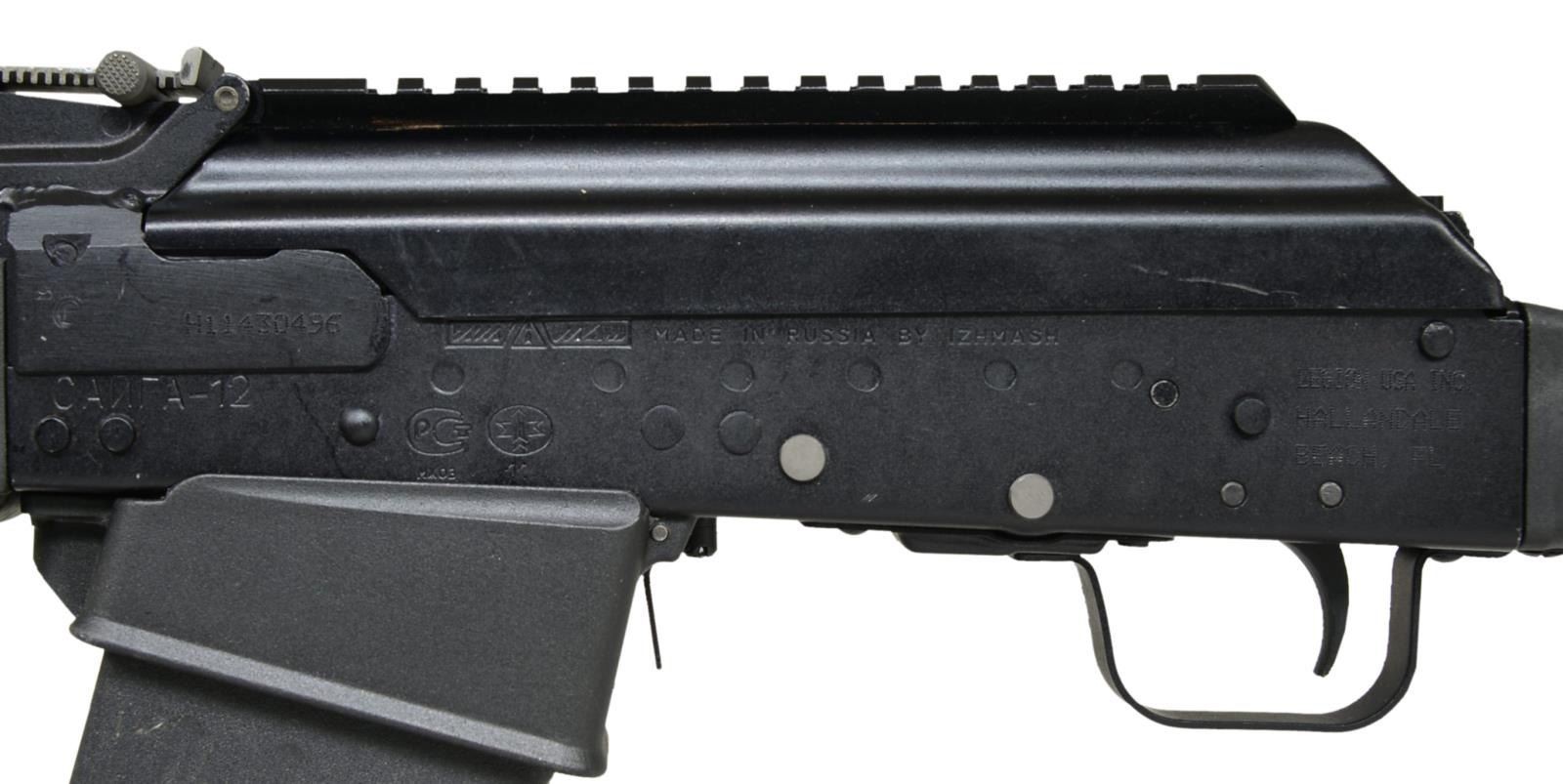 VEPR MAG. CONVERSION. Cal. 12 Ga. S# H11430496. Bbl. 19". The Saiga-12, as w/ it’s close relative the VEPR-12, have become extremely desirable shotguns, especially since halting sales from Russia. This particular version, imported through Legion USA in Hallandale, FL. may arguably be the best of both platforms. A true Saiga-12 mfg. by Izhmash that is modified to utilize the popular VEPR-12 mag. The 19" bbl. is terminated w/ right hand exterior threads & a thread protector. The front sight is the traditional protected post at the end of the gas block. Rear sight w/ a radius of 10" is a tangent style marked to 1000m. Hinged top cover that provides 7" of picatinny rail real estate. Right hand controls, black plastic furniture suitable for sling mounting on either right or left side. Factory finish on exposed metal surfaces is a dark black. Firearm appears unmolested by 922r standards & still retains the traditional sporting style shoulder stock. MAGS: 2 TOTAL; 1-10 rd. & 1-5 rd. mag. UNATTACHED ACCESSORIES: factory Izhmash shipping box, owner’s manuals, cleaning kit. CONDITION: all outward aspects illustrate extremely little use, if any beyond factory test firing. Receiver finish wear at junction w/ selector has only earned a tiny line indicative of very little operation. Bore is mirror shiny. Fire control mechanism appears to function correctly when cycled by hand. (21-740/JZ). MODERN. $600-1,000.