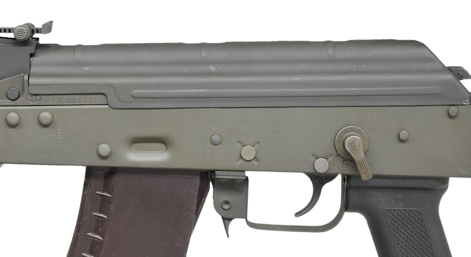 INTERARMS. Cal. 5.45x39. S# TTL-C01797. Bbl. 16 1/2". A Polish WZ88 TANTAL build from Interarms. Correct 4" muzzle brake & right side folding wire stock. Black plastic pistol grip w/ red bakelite type handguards. Left side sling swivels. Stamped receiver. Tapco G2 trigger. Protected post front sight in bayonet lugs secure on board cleaning rod. Tangent rear sight marked to 1000m. Ambidextrous safety/selector. Marked on left side of receiver “C-P-S”, on right side of receiver marked “S-F”. Greenish gray matte finish parkerizing on all exposed metal surfaces. Left side sling swivels host green canvas sling. MAGS: 1-30 rd.; correct brown plastic. UNATTACHED ACCESSORIES: VSIM transport bag. CONDITION: finish coverage is completely consistent w/ only light thinning at points of mechanical intervention pointing to what appears to be very low use. Stock has rubber buffer inserted at top to cut down on noise while folded. Furniture is free of any noticeable blemishing. Bore is shiny w/ well pronounced rifling. Fire control mechanism appears to function correctly when cycled by hand. (21-783/JZ). MODERN. $600-900.