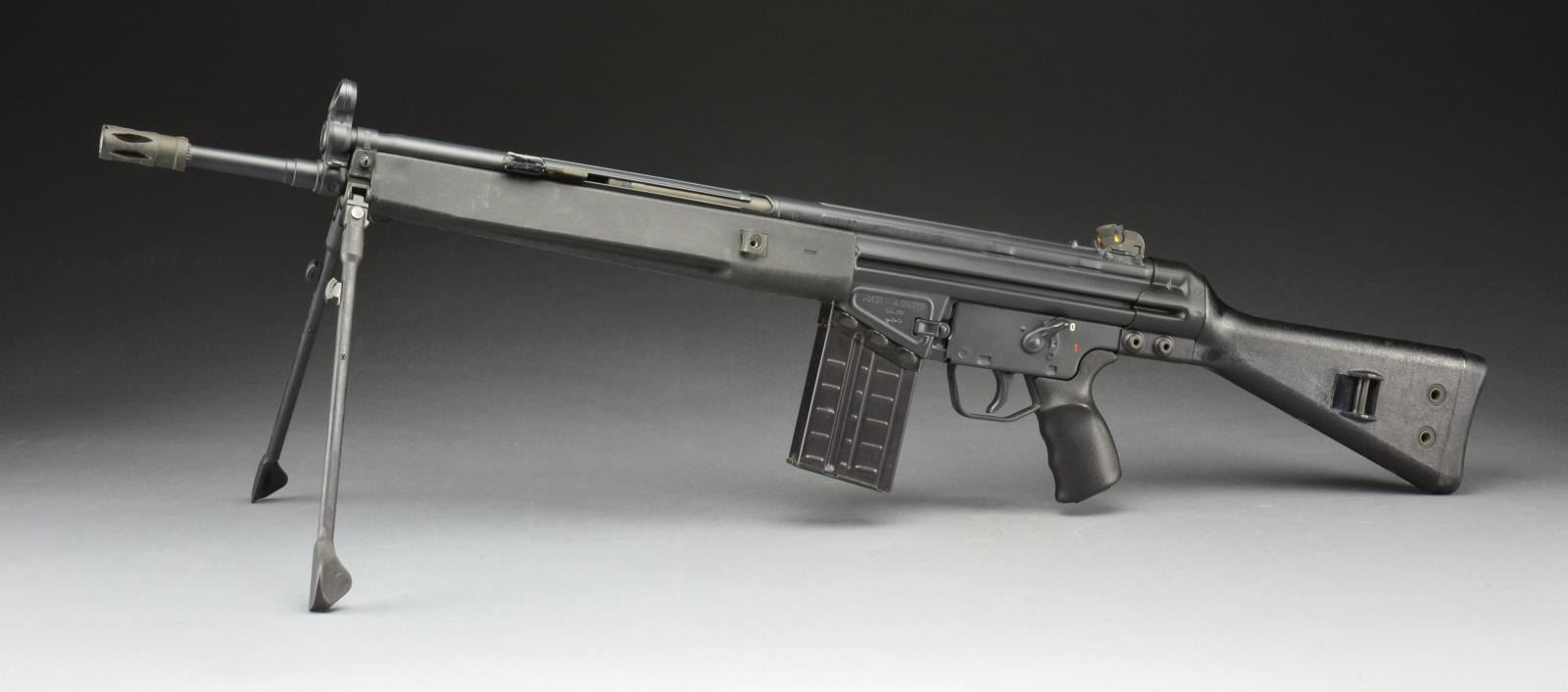 Cal. 308. S# A056217. Bbl. 17.7" w/ factory flash hider. Standard A-2 model w/ black plastic stock set. Includes factory bipod. Factory 4 position drum style rear sight assembly. Hooded post front sight. Push button mag. release w/ 0-1 metal clip on trigger housing. Mag. well right side marked, "Made in Germany, HK Inc., Arl. Va. 22- 201". Left side mag. well marked, "HK91 A038695, Cal..308, eagle IC antler" indicating 1982 mfg. MAGS: 3 aluminum 20 rd. UNATTACHED ACCESSORIES: HK heavy padded transport bag. CONDITION: light black factory paint on all exposed metal surfaces remains consistent & correct. Light thinning in areas that coincide w/ scope mt. use. Furniture free of any noticeable outward defect. Bipod folds correctly & locks tight both in open & closed position. Bore is shiny w/ well pronounced rifling & fire control mechanism appears to function correctly when cycled by hand. (21-771/JZ). MODERN. $1,800-2,500.