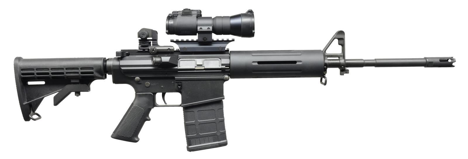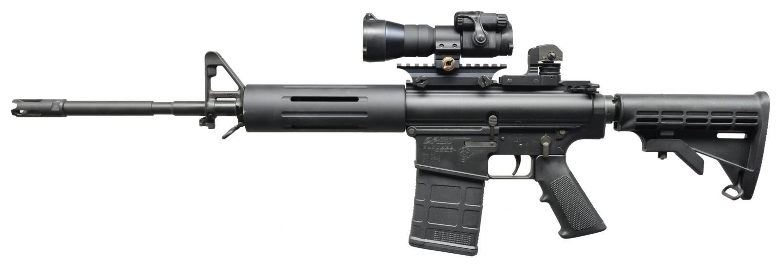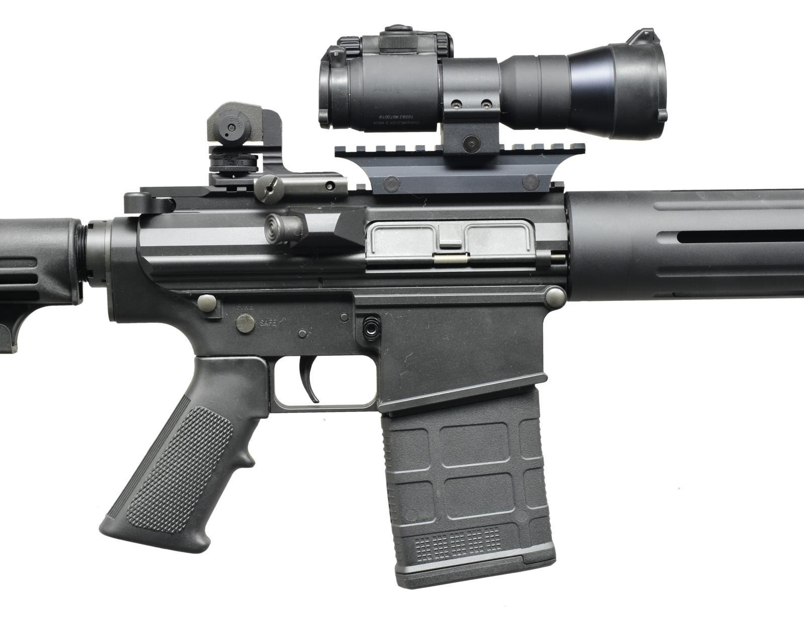 Cal. 308 Win. S# 101199. Bbl. 16 1/2". The DPMS LR-308 carbine was an early contender blending accuracy & sm. size in the AR-10 type configuration. Dark matte black finish on all exposed surfaces. M4 type bbl. profile w/ proprietary DPMS muzzle brake. Traditional early front sight/bayonet lug/gas block just forward of the free floating tubular handguard. Flat top upper receiver w/ riser & Aimpoint Comp ML2 2X2 MOA sight cowitnessed w/ fully adj. E2 style removable rear sight. Brass deflector/forward assist combo w/ dust cover. Left side controls. 6 Position collapsible shoulder stock w/ standard sling swivels front & rear. MAGS: 2-20 rd. P mags. & 4 DPMS metal 20 rd. UNATTACHED ACCESSORIES: dust covers for P mags., DPMS bolt component repair kit, original patch & paper work, spare low profile gas block, original cleaning kit, spare DPMS crush washer, Blackhawk nylon padded transport case. CONDITION: finish is complete & consistent on the entirety of the system, the extremely light wear on the brass deflector indicates very little use beyond test firing which is also confirmed by all other outward appearances, Aimpoint sight appears to function correctly, shiny bore w/ strong rifling. Fire control mechanism appears to function correctly when cycled by hand. (21-423/JZ). MODERN. $900-1,400.