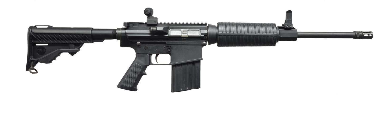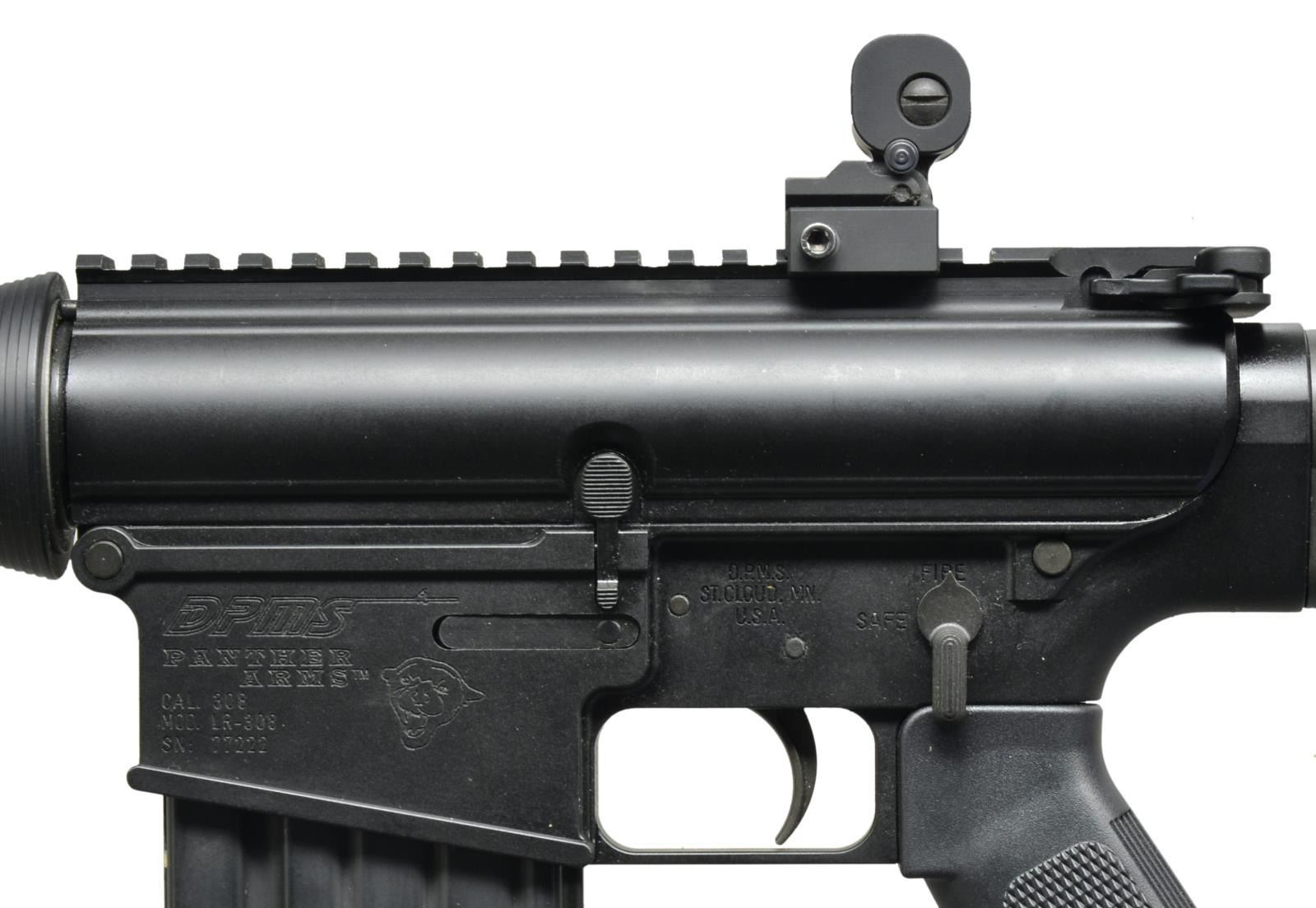 Cal. 308 Win. S# 77222. Bbl. 16". One of the earliest modern entrants in the 7.62 cal. black rifle carbine category. At first glance it heavily resembles a traditional CAR-15, but the mag. well shape gives it away. Flip up sights, front & rear. A2 Carbine style handguards w/ delta ring. 1-in-10 Rate of twist bbl. terminated w/ A2 style flash hider. Flat top upper receiver w/ integral brass deflector & rnd. forward assist & 6 position factory collapsible stock w/ rear sling attachment point. Dark black anodized finish. MAGS: 2-20 rd. metal; 1 DPMS & 1 Pro-mag. CONDITION: all exposed metal surfaces enjoy complete coverage w/ light thinning on receiver rail from previous optic mounting. Overall, the firearm appears fine. Bore is shiny w/ strong rifling. Fire control mechanism appears to function correctly when cycled by hand. (21-289/JZ). MODERN. $700-1,100.