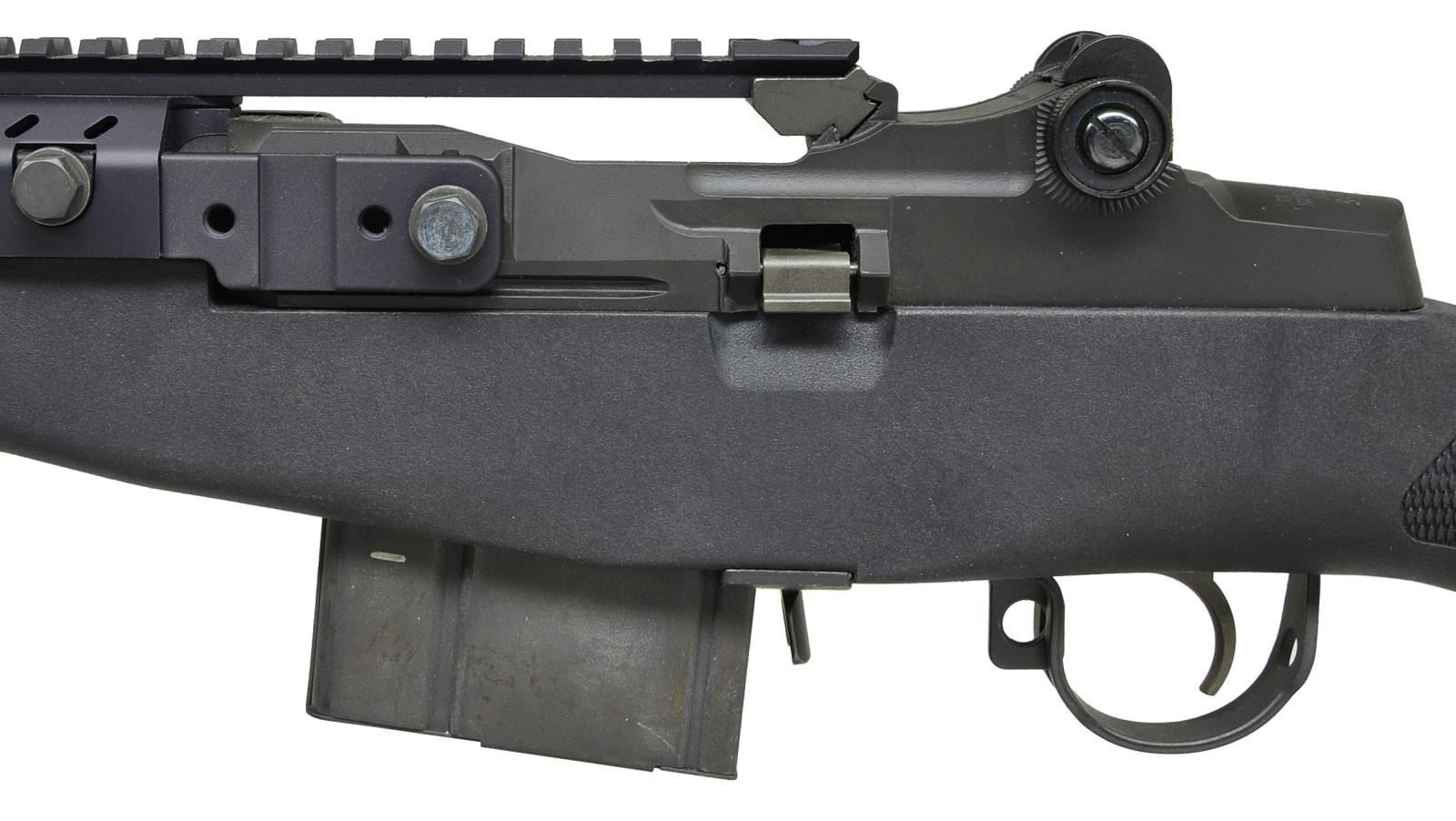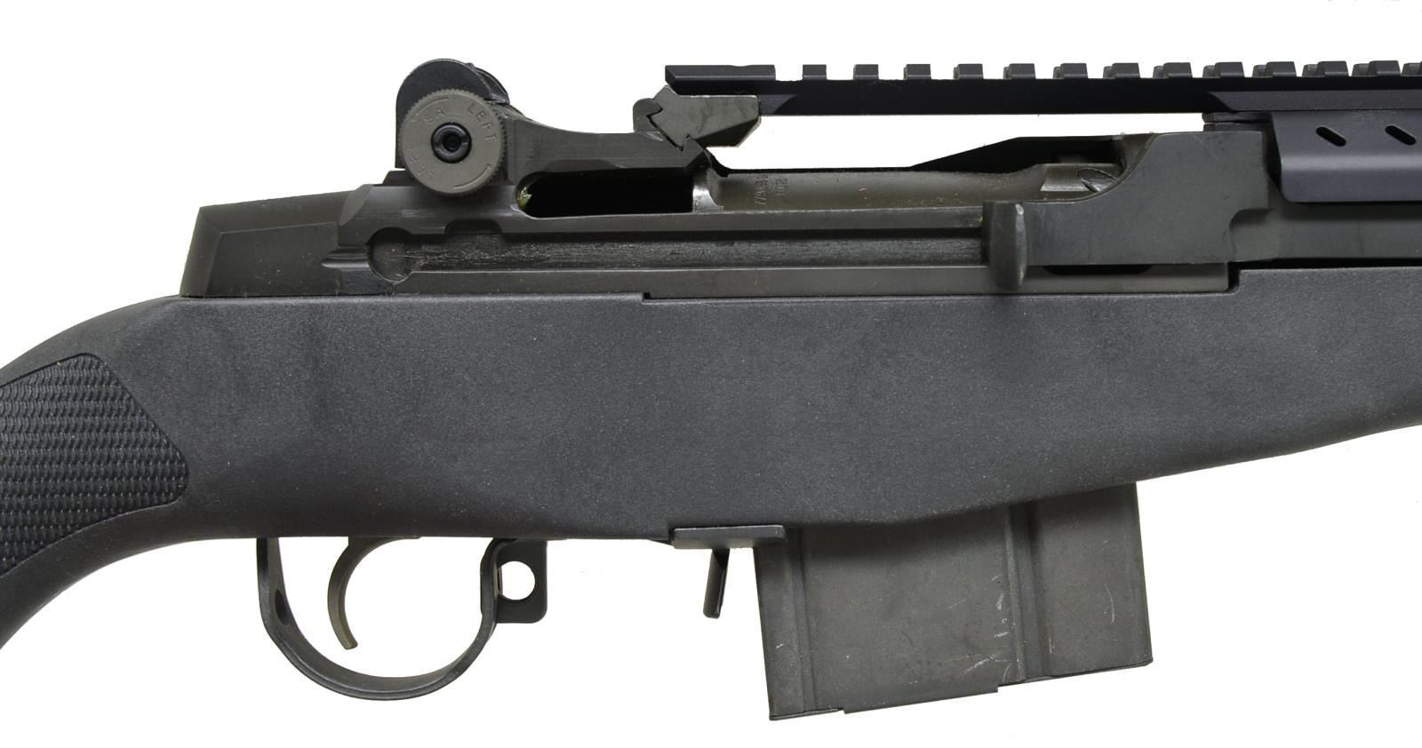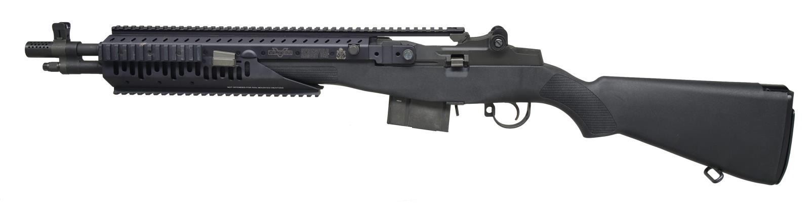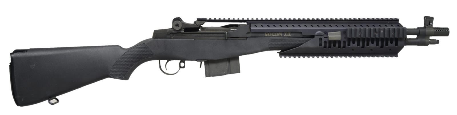 RAIL. Cal. 308 Win. S# 308716. Bbl. 18" over brake. The SOCOM II is perhaps the best of both worlds between an accurate lg. caliber & a short convenient weapon platform. The M1A has always been highly touted for its abilities & the VLTOR SOCOM series stock system provides enormous amount of rail space for the addition of modern accessories. With rails at 12, 3, 6 & 9 o’clock, the top rail spans over 17" alone. Protected blade front sight w/ insert w/ more than a 20" radius from the windage & elevation adj. rear peep sight. Heavy synthetic trapdoor stock w/ buttplate/shoulder rest. Matte black parkerized finish on all exposed metal surfaces. MAGS: 1-5 rd. CONDITION: all outward appearances indicate very low usage if any. Neither stock, chassis, nor action exhibit any wear typically associated w/ use. Bore is shiny w/ good rifling. Fire control mechanism functions correctly when cycled by hand. (21-707/JZ). MODERN. $1,200-1,800.