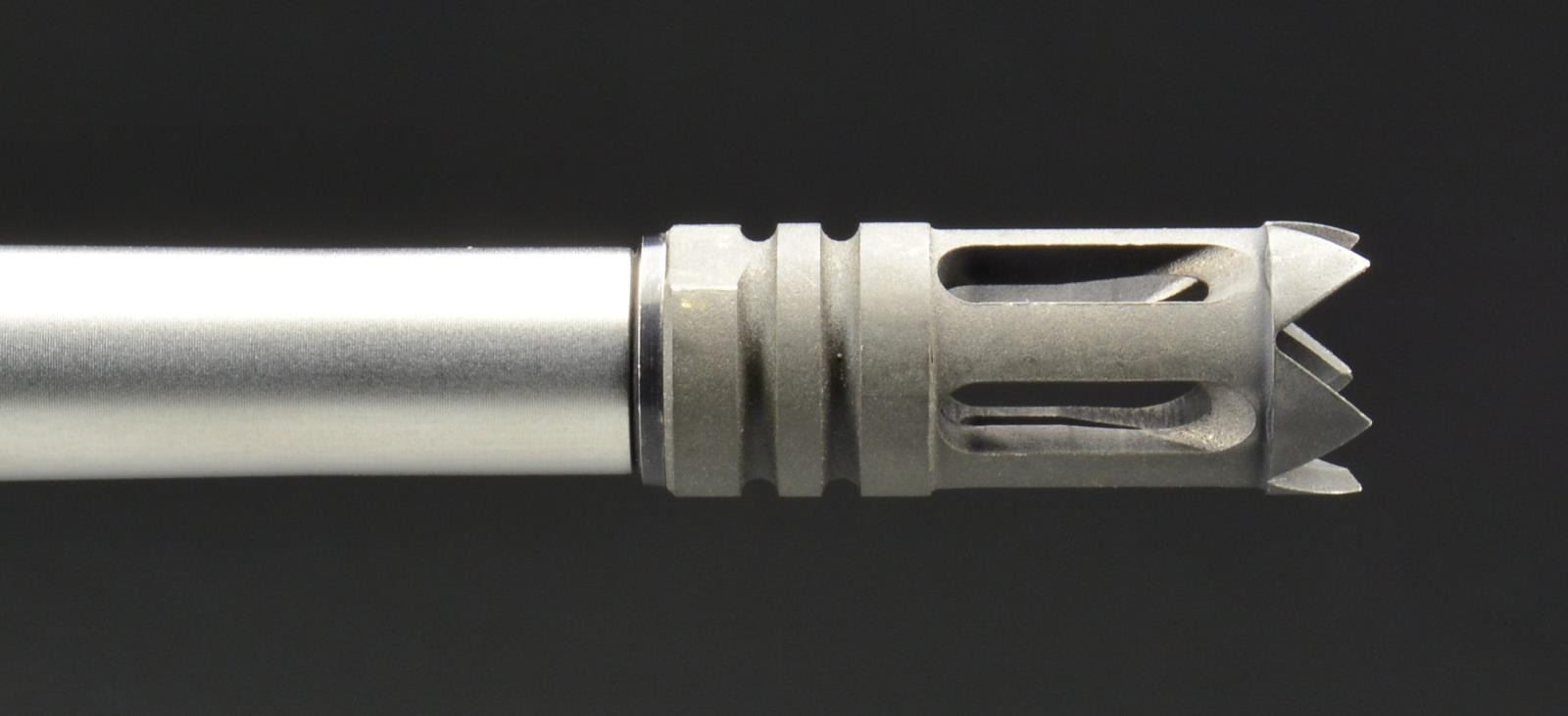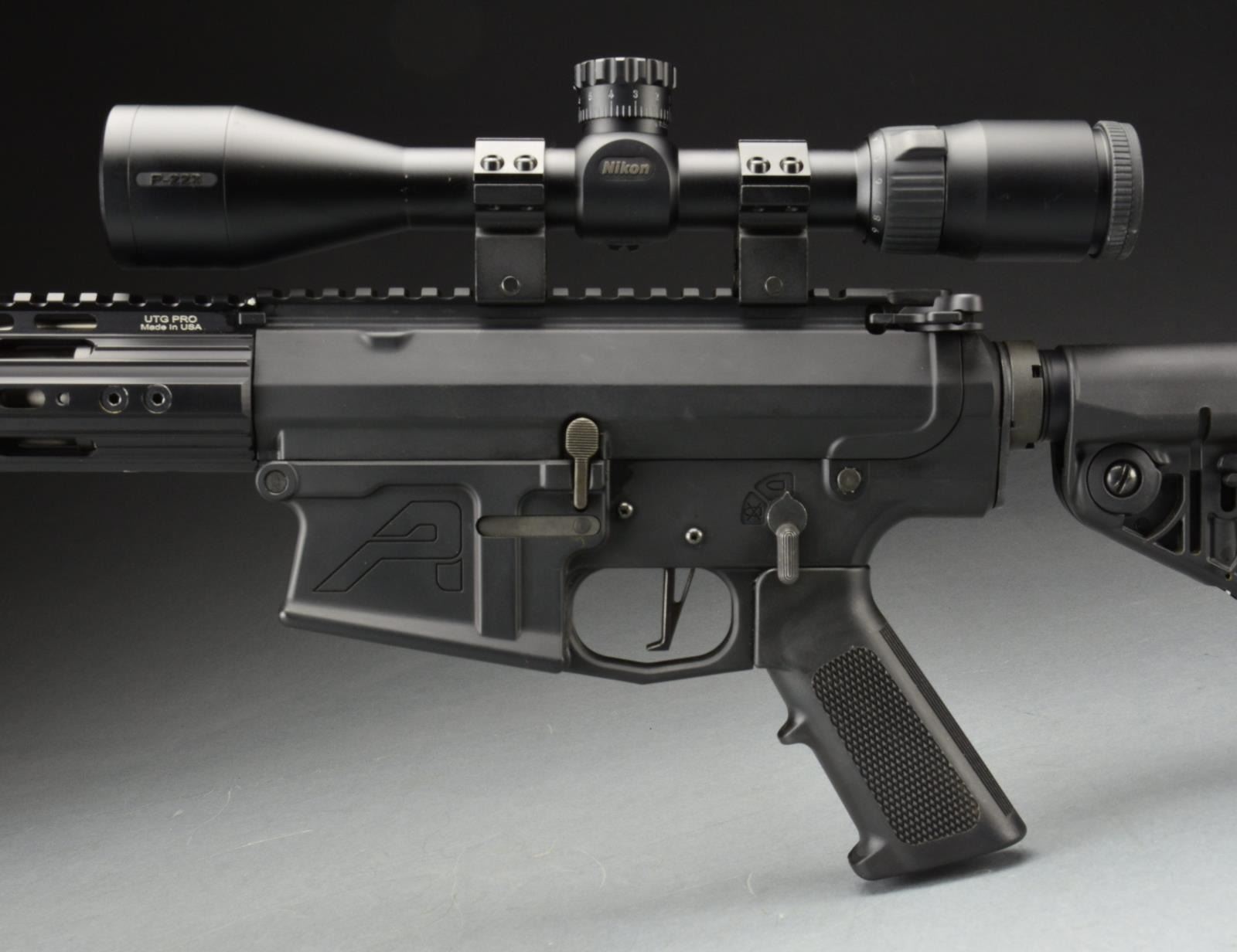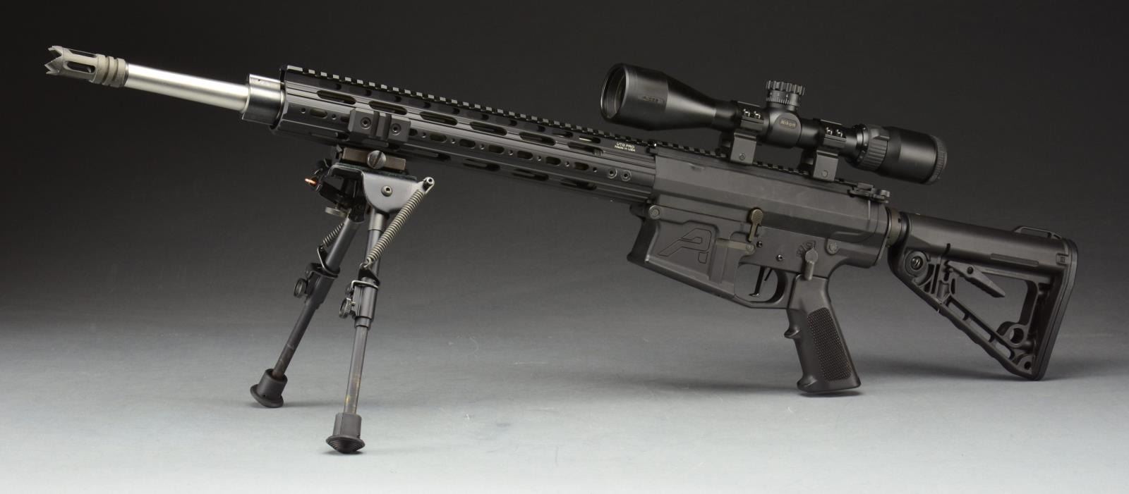 Cal. 308. S# US05455. Bbl.18". Stainless bbl. terminated w/ threaded muzzle & spiked flash hider. Low profile gas block forward of UTG Pro handguard provides over 12" of additional picatinny rail forward of receiver. Currently sporting Harris 1A2 Ultralight bipod at 6 o'clock. Flat top upper receiver w/ brass deflector & rnd. forward assist hosts Nikon P-223 3-9x40 scope. Aero lower receiver pictogram marker on left & right w/ left side primary control. Drop in trigger possibly a CMMG single stage, breaking at just under 3 lbs. 6 position American Tactical Super-Stoc. MAGS: 1-30 rd. Pmag. UNATTACHED ACCESSORIES: all weather tactical foam lined transport case. CONDITION: finish on exposed surfaces consistent & complete w/ majority of noticeable use where brass connects w/ deflector. Bore is shiny w/ strong rifling. Nikon glass has clear appearance w/ sharp reticle. Single stage trigger breaks clean & crisp. Fire control mechanism appears to function correctly when cycled by hand. (21-1549/JZ). MODERN. $900-1,400.