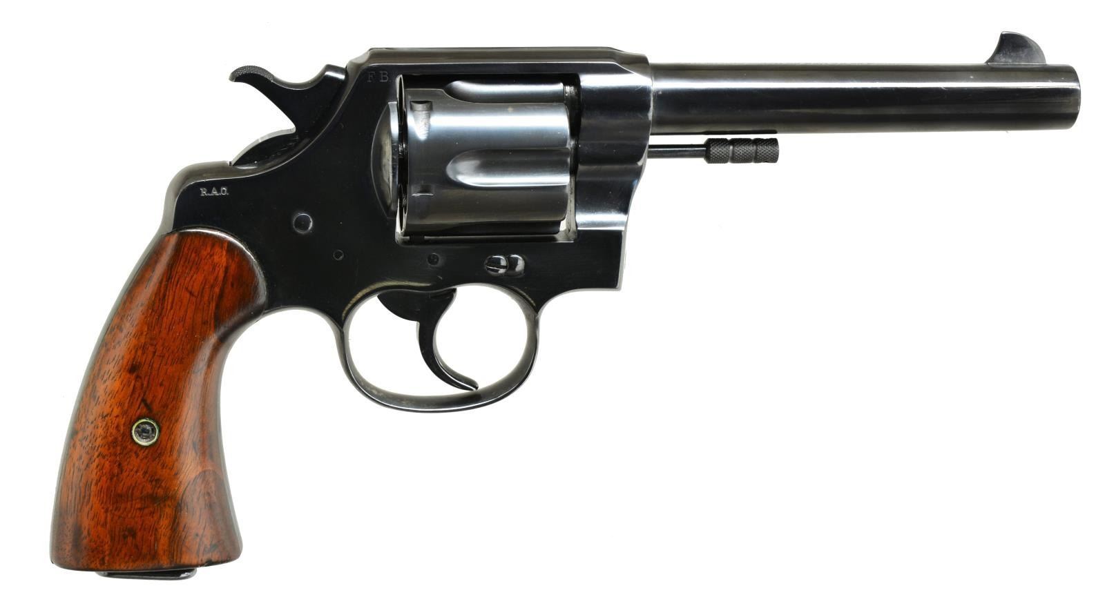 Cal. 45 Colt. S# 33307. Bbl. 5 1/2" w/ blade sight. 6 Shot fluted swing out cyl. Right side of frame has "R.A.C" & "FB" inspectors marks. Cyl. latch is marked "K". Butt of gun is marked "U.S. / ARMY / MODEL/ 1909" above lanyard loop, followed by "No / 33 / 307". 2 Piece walnut grips. 1911 Mfg. CONDITION: over 97% brightly polished reblued metal finish showing some light pitting & weakened markings. Grips are sanded & refinished w/ cartouches removed. Bore is bright w/ strong rifling. (21-1567/DS). CURIO. $500-700.