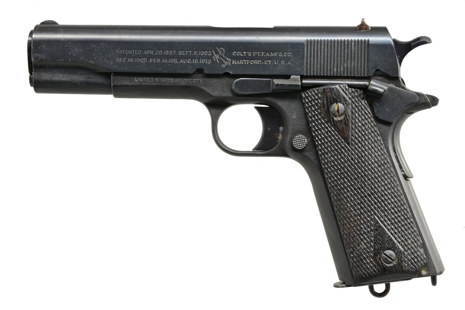 Cal. 45 ACP. S# 326065. Bbl. 5" Type 5 w/ joined "HP" proof. Mfg. 1918 w/in 347,000 unit Army contract. Most correct features & markings including Eagle "S14" proof plus "H" provisional acceptance mark on slide & top of frame. Thumb safety has correct thick tab but w/out milling undercut as used after S# 425000. Type 5 bbl. & some type 4's used after S# 425000. Correct Type C border checkered hammer created from modified Type B w/ shorter spur. MAGS: fair Springfield Armory 7 rd. w/ lanyard loop mfg. 1914 - March 1916. Noticeably cleaned pitting & no finish. UNATTACHED ACCESSORIES: generic storage box. CONDITION: very good general appearance as refinished over some areas of prior pitting mostly at front of slide. Clear markings w/ slight thinning near front left side of slide. Finish has somewhat dull tone, especially on frame. Good grips w/ noticeable wear at bottom of each. All of bbl. exterior polished bright having plated appearance; normal appearing port section. Good plus bore w/ light wear & hint of frosting. (21-963/NW). CURIO. $1,000-1,500.