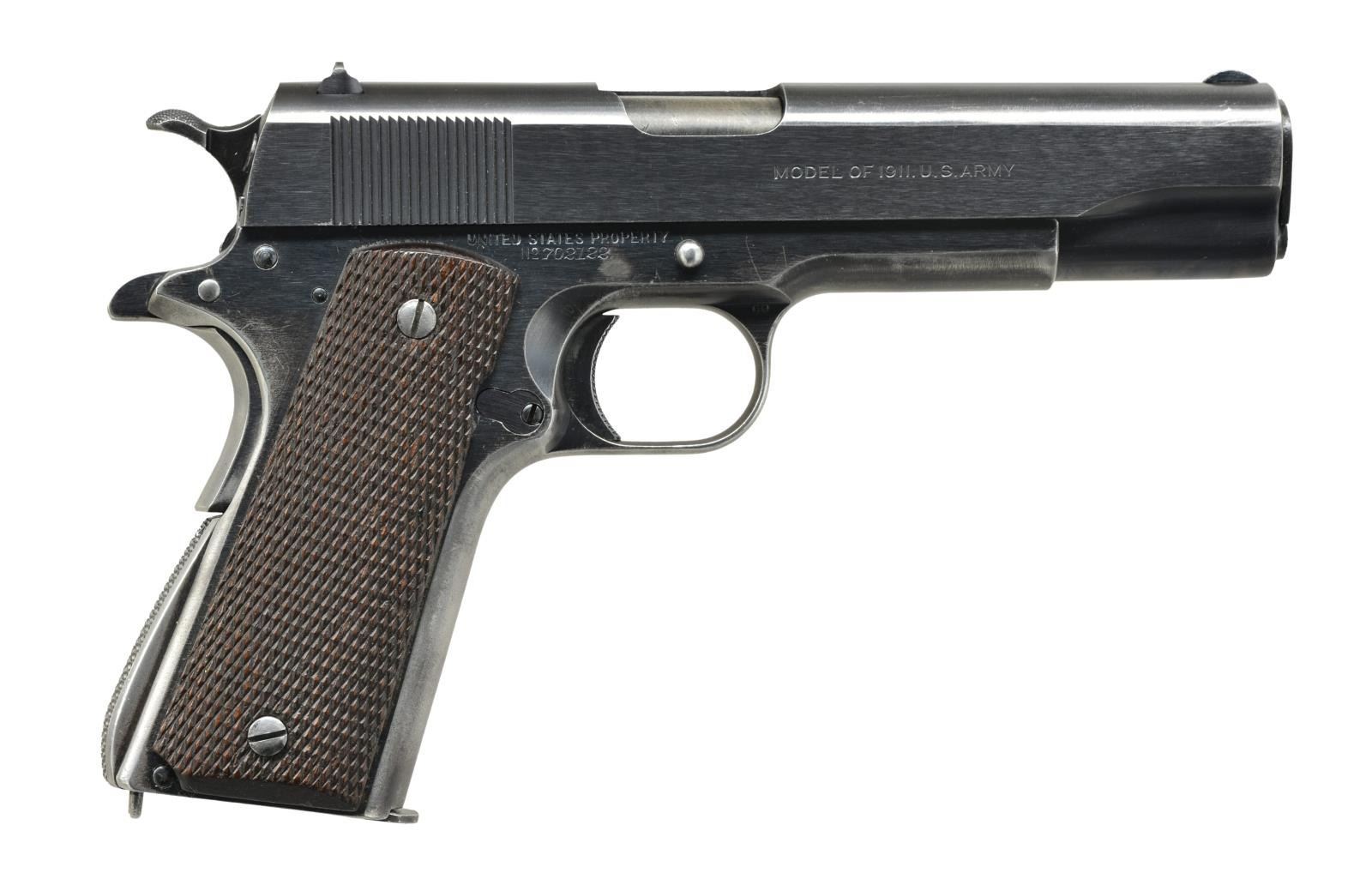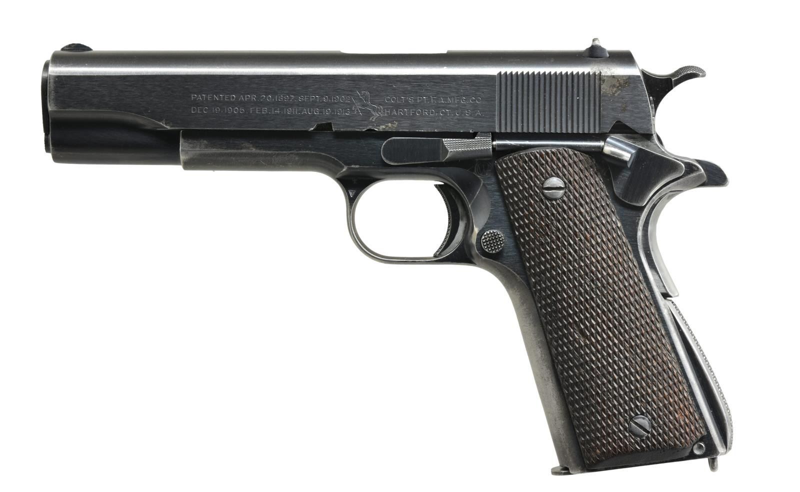 Cal. 45 ACP. S# 702122. Bbl. 5". Shipped Feb. 13, 1924 to Springfield Armory; 1,000 units. Most correct transitional features including: trigger relief cuts, short trigger, long tang safety & coarse checkered Type 3 mainspring housing w/ 27 diamonds (not 32). Checkered thumb safety & slide stop w/out milled undercuts. Properly marked slide w/ 1911. Frame w/ “WTG” inspection mark. Full checkered walnut grips. Slide not numbered under firing pin stop. “H” acceptance mark on rear of slide & by disconnector also having “G”. Type 5 bbl. w/ “G” in front of legs. Later style rear sight w/ wide square cut notch; Correct profile front sight but .102" wide instead of .058". MAGS: 1 very good unmarked 2 tone 7 rd. UNATTACHED ACCESSORIES: 2018 dated factory letter. CONDITION: very good appearance w/ Colt Brushed Blue. Very clear markings throughout. Noticeable thinning on front strap & slight holster like high point wear on slide & dust cover. Light scratch from improper slide stop installation. Very good grips w/ minimal diamond top wear; sm. chip on left grip & bright worn screws. Good bbl. finish w/ near excellent bore. (21-26/NW). CURIO. $1,500-2,000.