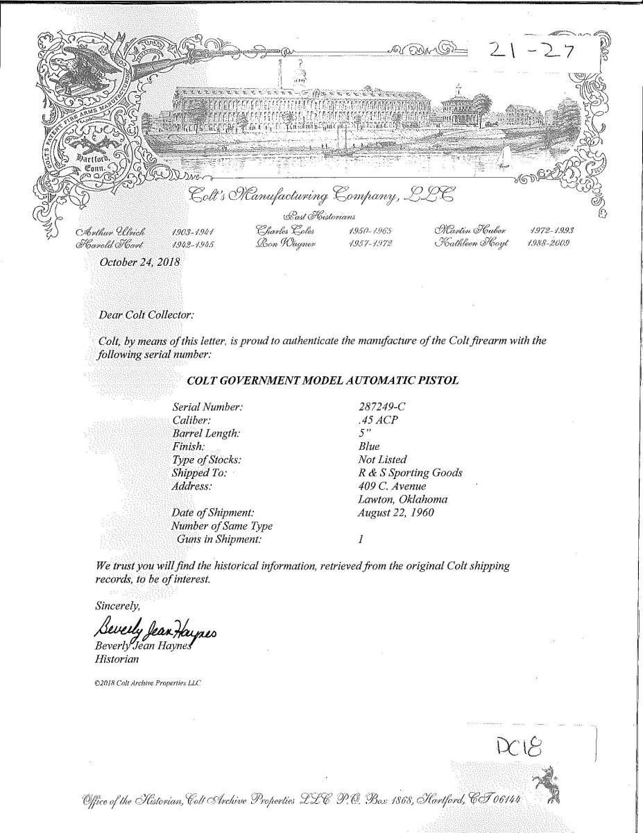 Cal. 45 ACP. S# 287249-C. Bbl. 5". Serrated ramp front sight w/ fixed square notch rear sight. Blue finish. Grooved trigger. Hammer has polished sides. 2 Piece checkered Coltwood grips w/ Rampant Colt medallion on right panel. MAGS: 1 detachable 7 rd. UNATTACHED ACCESSORIES: Colt factory letter providing the following information "Serial Number: 287249-C / Caliber: .45 ACP / Barrel Length: 5" / Finish: Blue / Type of Stocks: Not Listed / Shipped To: R & S Sporting Goods / Address: 409 C. Avenue Lawton, Oklahoma / Date of Shipment: August 22, 1960 / Number of Same Type Guns in Shipment: 1". CONDITION: 95% blue showing light muzzle & edge wear w/ scattered sm. marks. Sides of hammer show sm. dark spots. Very good grips. Bright bore w/ sharp rifling. (21-27/DS). CURIO. $1,500-2,000.