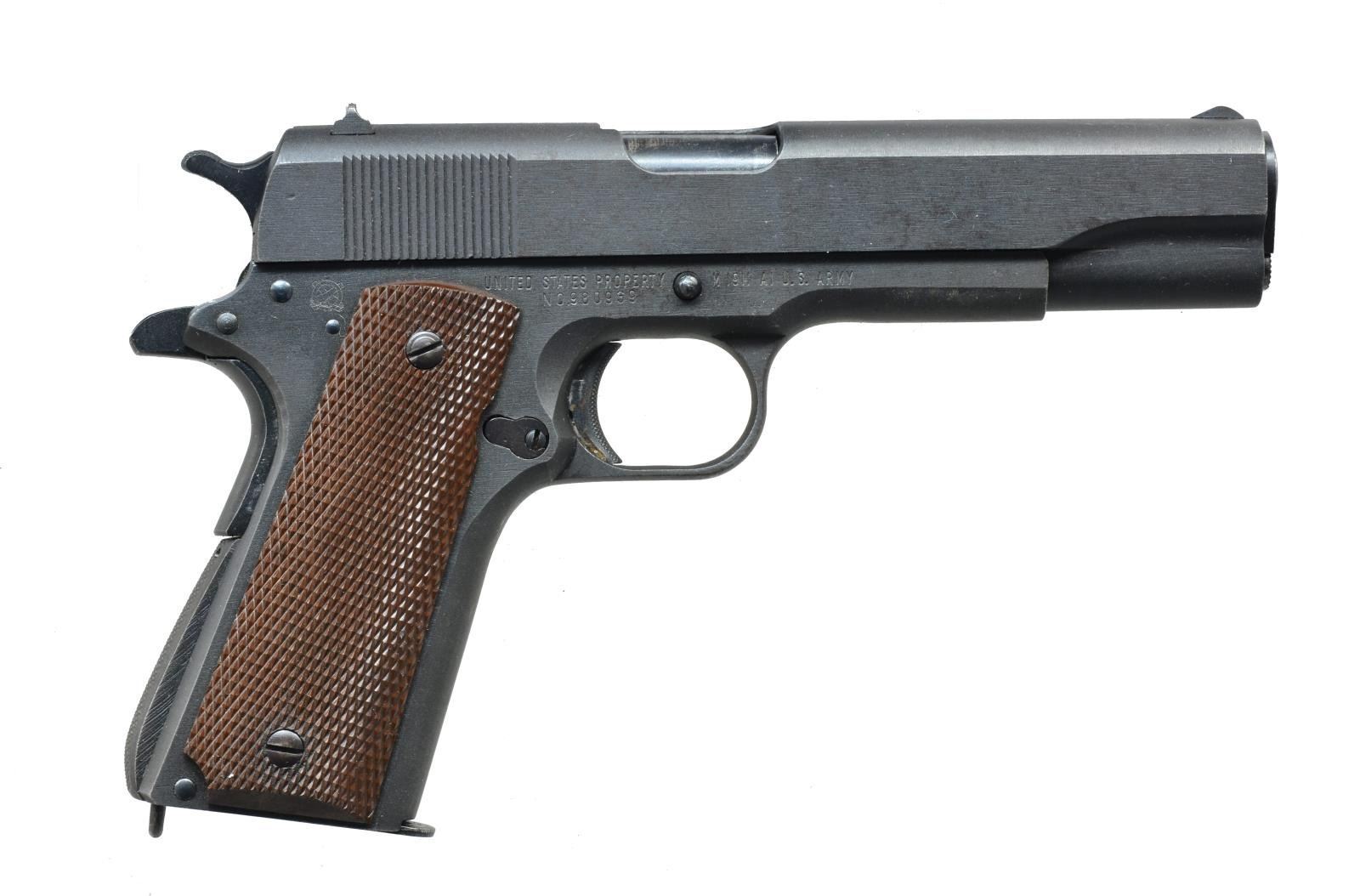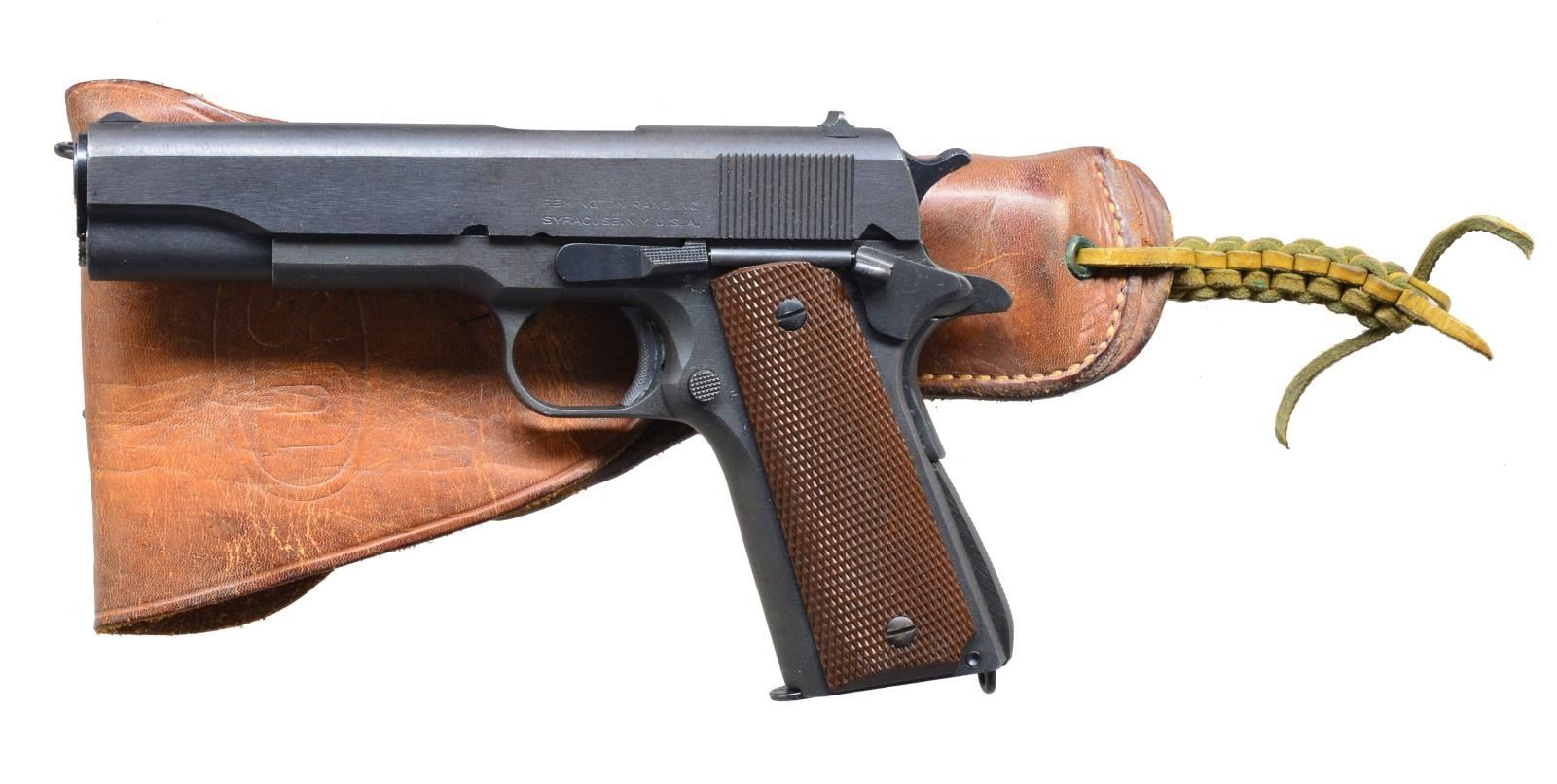 Cal. 45 ACP. S# 980939. Bbl. 5" Colt Type 6 as used on earliest models; "P " on left leg & "G" in front of legs. Mfg. 1943 w/ all correct early features such as: Type 2 finely checkered arched mainspring housing w/ lanyard loop plus checkered w/out milled undercut slide stop & thumb safety. "P" proofs on frame & top of slide. Crossed cannons on top right rear of frame. "FJA" inspector mark. Correct Type 9 Keyes Fibre plastic grips w/out screw rings. Du-Lite finish over sandblasting w/ faint 2 tone appearance about mid point of slide. Sharp clear markings throughout. Correct sights; serrated front & square notched rear. MAGS: 3 very good 7 rd. of which 2 mfg. by Scovill, 1 by M.S. Little (both used by Remington). UNATTACHED ACCESSORIES: Sears 1942 dated brown U.S. flap holster w/ brass stud & square braided tie down. Good to very good w/ light cracking of leather & verdigris around rivets. CONDITION: very good overall appearance w/ faint beginning high point wear on slide; light to medium marks on frame mostly around slide stop area plus typical marks from improper stop installation including onto slide. Near excellent bore & grips. (21-1295/NW). CURIO. $1,200-1,800.