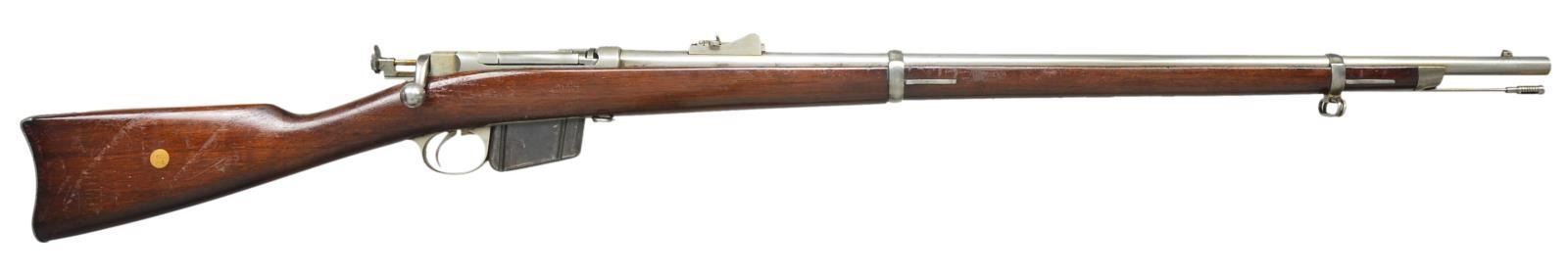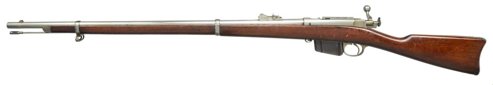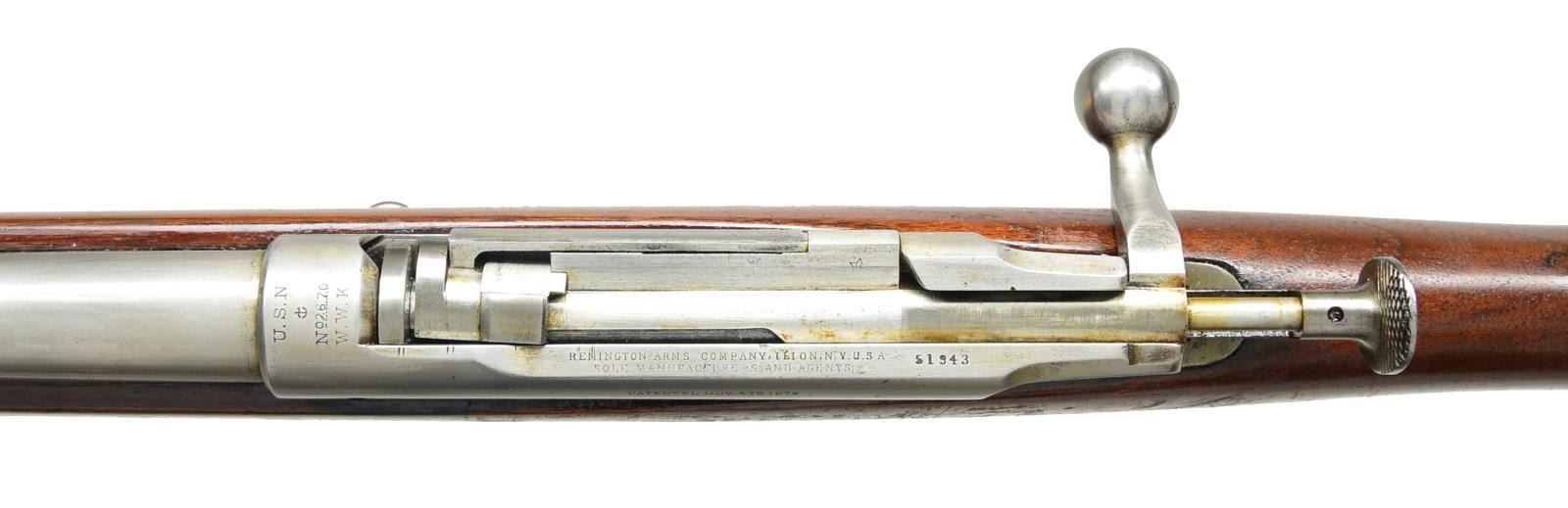 ACTION RIFLE. Cal. 45-70. S# 51943. Bbl. 32 1/2". U.S. Springfield buckhorn type rear sight marked on left side w/ "R". Sight ladder does not have "N" at top left. Stud type front sight w/ pinned blade. Receiver is marked on left rail "REMINGTON ARMS COMPANY, ILION, N.Y. USA SOLE MANUFACTURERS & AGENTS" "PATENTED NOV 4TH 1879." Receiver ring marked on top "U.S.N." "(anchor)" "No. 2670 WWK" indicating inspection by W.W. Kimball. Receiver has additional "H" in star on the rear left corner. The star also appears on top of the locking lug on the bolt. Cleaning rod is present. 2 Band design has stacking swivel & sling swivel in upper band. Rear sling swivel is at forward end of trigger guard. Unmarked walnut stock. UNATTACHED ACCESSORIES: 5 shot blue steel detachable magazine. CONDITION: stock has professional refinish w/ added coat of lacquer as preservative & given numbered paper disc on right side of butt. Lacquered finish has thinning wear & flaking throughout. Metal parts are finished bright w/ light wear, scattered spots of peppery oxidation & light staining. Bore has sharp lands, but scattered pitting throughout. (01-19345/RW). ANTIQUE. $1,200-1,600.