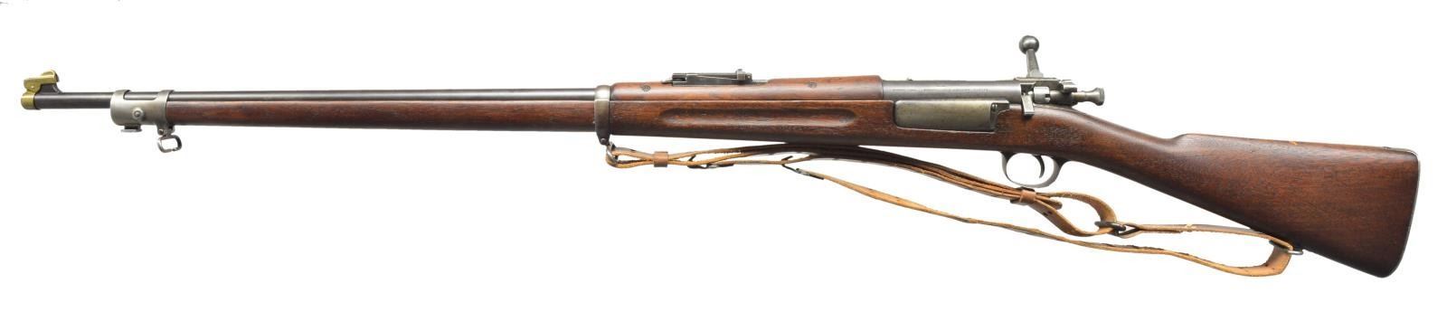 Cal. 30-40 Krag. S# 137276. Bbl. 30". Model 1901 ladder rear sight graduated to 2000yds. Blade front sight. Walnut stock set. Stock has faint boxed JSA 1898 inspectors mark. Encircled script "P" under grip. Trap buttplate has curved toe. Vintage military style sling. Brass muzzle cover & sight protector. CONDITION: Stock set has light professional type refinish w/ slight loss of wood around buttplate & receiver tang. Buttstock has repaired crack extending from trigger guard upward into comb area w/ sm. filled area at comb. Metal has traces of blue turning overall gray w/ patina & light wear. Bore is dark but retains strong rifling. (21-998/RW). CURIO. $700-900.