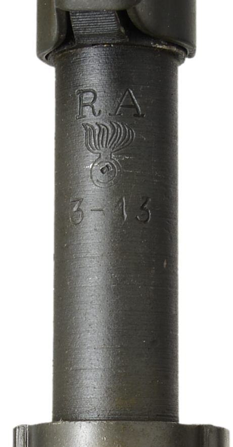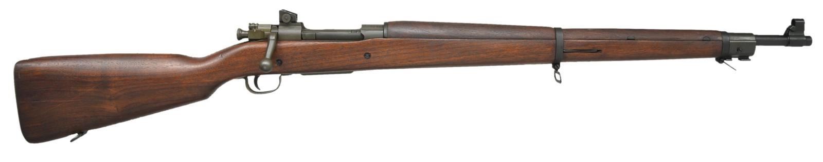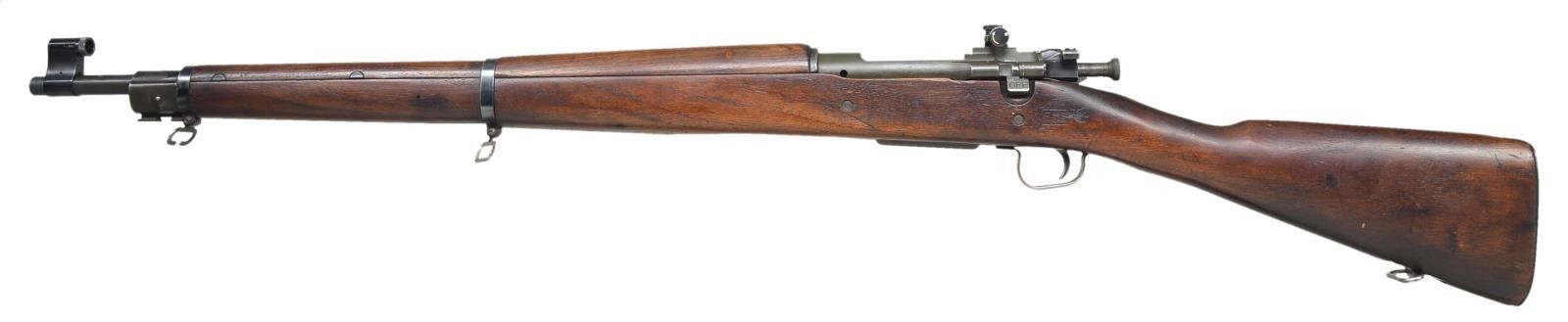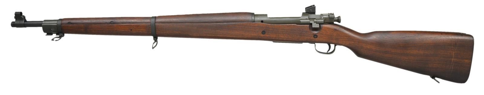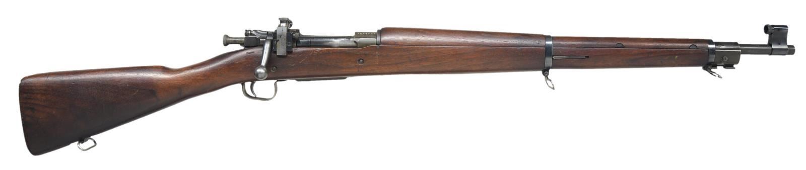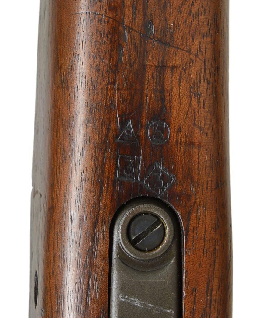 1) SMITH CORONA 03-A3. Cal. 30-06. S#4802837. Bbl. 24", marked behind front sight “SC” “flaming bomb” “10-43”. Rear sight has been replaced by Lyman 48 aperture rear sight w/ target knobs. Slide is graduated to 60 points. Original front sight replaced w/ Lyman target front sight w/ interchangeable inserts. Aperture insert is present in sight. Bolt has correct scalloped sleeve. Bolt marked “R”. All stamped furniture including correct lg. bow trigger guard & checkered trap buttplate. Walnut stock set. Buttstock marked on left side w/ boxed “FJA”. (Crossed cannons), marked under grip w/ encircled “P” & “K”. Assembly numbers stamped ahead of trigger guard. CONDITION: stock has lg. percentage of original finish w/ moderate wear, staining & handling marks. Metal has 75% original blue & parkerized finish w/ light wear & scattered scratches. Markings have been enhanced in white. Near excellent, shiny bore. (21-428/RW). MODERN. 2) REMINGTON 1903 A-3. Cal. 30-06. S#3526900. Bbl. 24”, marked behind front sight w/ “RA” “(flaming bomb)” “3-43”. Adj. aperture rear sight. Blade front sight w/ protective hood. Hood marked w/ “U.S.” & “(flaming bomb)”. All visible parts markings are “R” except sm. bow trigger guard is “Smith Corona”. All stamped furniture except smooth, milled buttplate. Replacement walnut stock set w/ scant grip buttstock. Marked on left side w/ boxed “OG”& under pistol grip w/ “P”. CONDITION: stock set has nice original finish w/ light wear & handling marks & notable scattered fine scratches on buttstock. Metal has 90% arsenal rework type parkerization. Fair, worn bore turning dark in grooves. (21-445/RW). CURIO. $900-1,400.