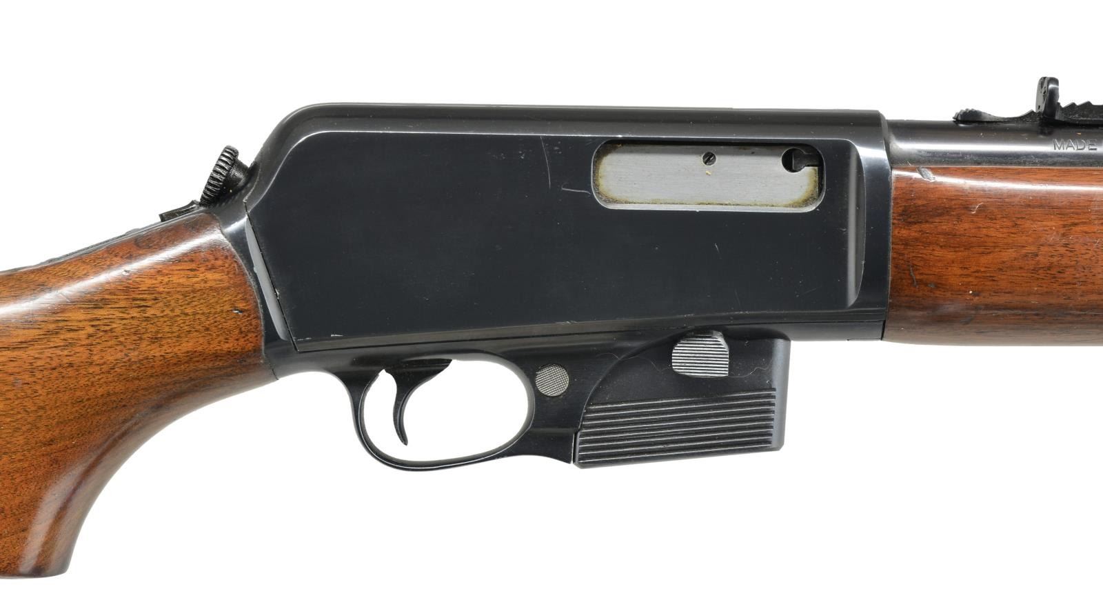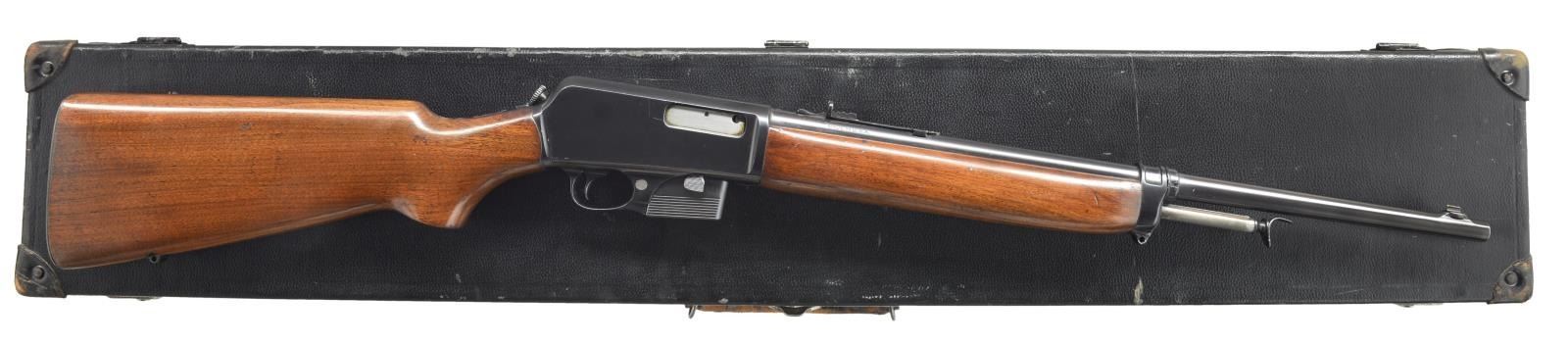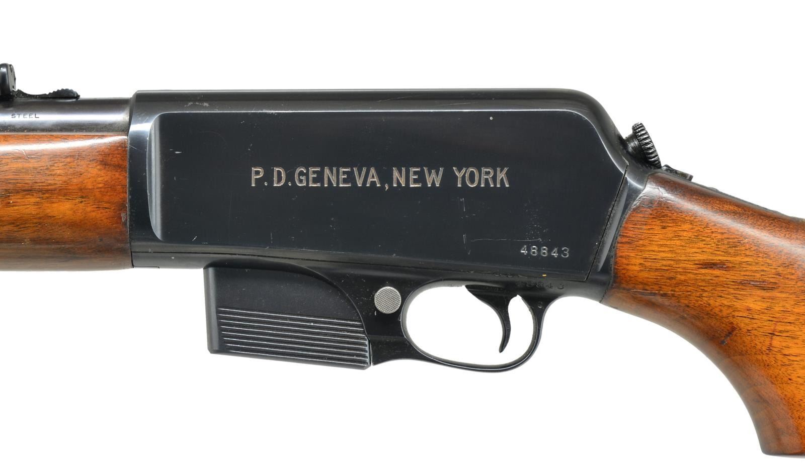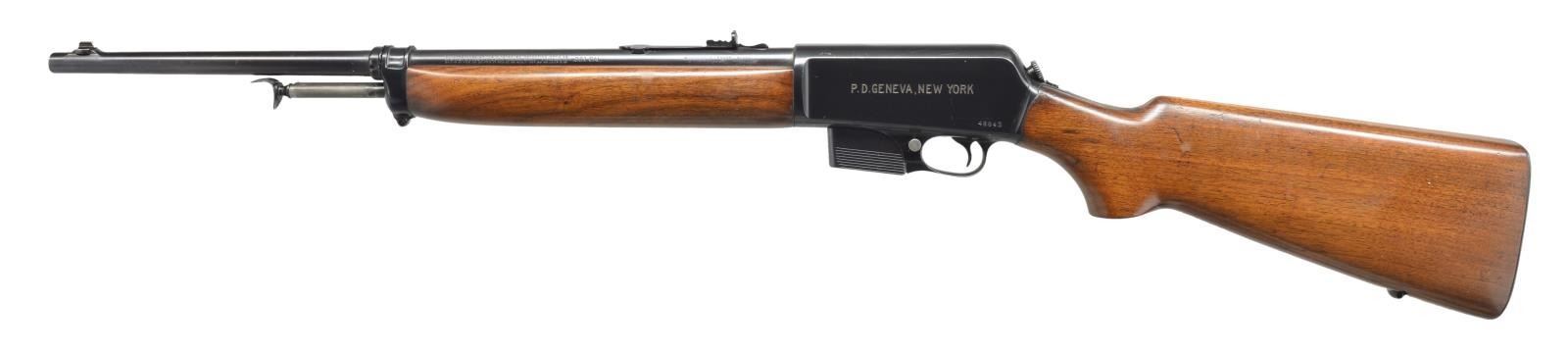 LOADING RIFLE. Cal. 351 Win. SL. S# 48843. Bbl. 20" rnd. Ramp mounted bead front sight & elevator adj. rear sight. Left side of action engraved "P. D. GENEVA NEW YORK" referring to the Geneva New York Police Department. Top tang has 4 line Winchester Trademark "MODEL 07 S.L.". Serrated mag. release button is located on right side of receiver along mag. Walnut forearm & pistol grip stock w/ swivel bases & grooved steel buttplate. Records indicate 1946 Mfg. MAGS: 1 detachable 5 rd. UNATTACHED ACCESSORIES: period FBI black leatherette covered carry case w/ blue velour interior for the Model 1907 & accommodations for 7 detachable mags. Lock is marked "EAGLE LOCK COMPANY / USA / TERRYVILLE CONN". Case exterior shows scattered scuffs & marks. Leather covered handle shows heavy wear. Case interior shows light wear & fading. Consignor states that this kit was purchased from a former FBI employee. CONDITION: over 97% blue showing scattered sm. scratches & marks. Buttplate retains 60% blue showing spots of flaking & light pitting. Original wood finish shows scratches & marks w/ rack wear mark behind top tang. Bore retains strong rifling showing spots of light pitting. (21-235/DS). CURIO. $2,500-4,500.