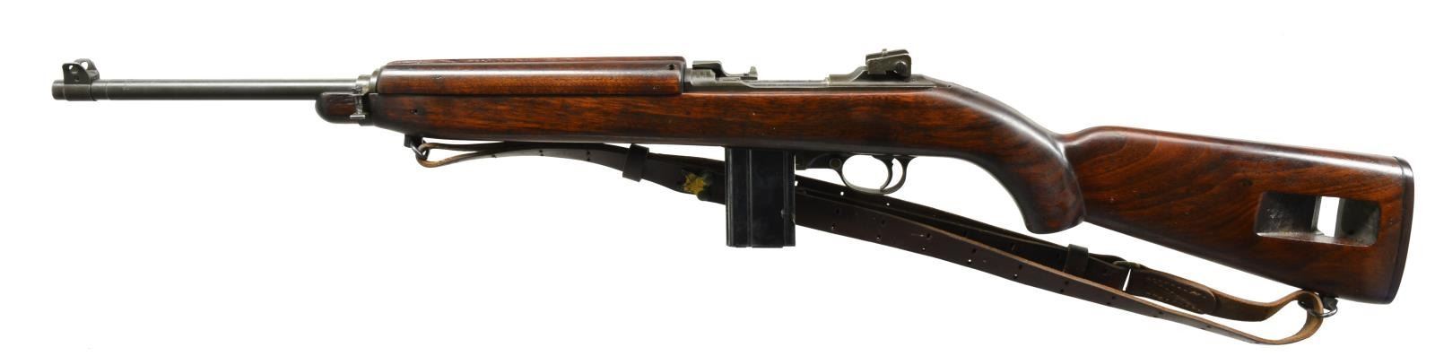 Cal. 30 Carb. S# 582483. Bbl. 18", marked behind front sight “INLAND MFG DIV GENERAL MOTORS 8-43”. Milled adj. rear sight marked “PI” & blade type front sight w/ protective ears. Narrow bbl. band is unmarked. Swivel is not present. Straight cut slide is marked “PI”. Flat bolt marked “IO”. Trigger housing is marked “INLAND”. Push button safety. Unmarked mag. catch. Dog leg hammer marked “H”. Low wood “I” cut walnut stock marked only w/ faint crossed cannons. 2 Rivet handguard. MAGS: 1-15 rd. marked "RUGG". CONDITION: stock has been refinished w/ reshaping of pistol grip, which has added commercial type 1.25" sling swivels & has 7/8" military style sling. Sling has wear & cracking. Metal has 70% original parkerized finish w/ thinning & wear. Rear sight is dented on both sides due to improper installation. Very good, shiny bore. (20-1622/RW). CURIO. $500-700.