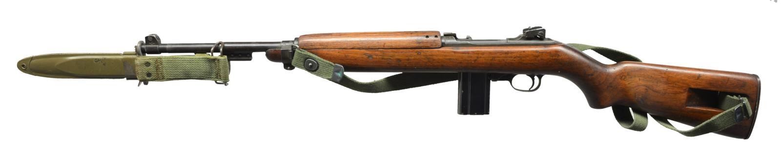 Cal. 30 Carb. S# 4024116. Bbl. 18", import marked at bottom. Bbl. marked behind front sight “UNDERWOOD 7-43” w/ flaming bomb. Milled adj. aperture rear sight marked “PI”. Blade front sight w/ protective ears. Bbl. band w/ bayonet lug marked “SI”. Straight cut slide marked “.U.”. Rnd. bolt marked “.U.”. Milled trigger guard marked “U” & in front of trigger guard marked “E”. Hammer marked “U”. Mag. catch has extension for 30 rd. mags. Oval cut, low wood stock w/ illegible markings on right side of butt. 4 Rivet handguard marked “HI”. Green web sling. MAGS: 1-15 rd. marked “UI”. UNATTACHED ACCESSORIES: 6 1/2" blade bayonet marked “U.S. M4 BREN-BAN". Black checkered plastic grips. Plastic & web scabbard w/ belt hook. “USM8A1TWB” marking. Bayonet has been sharpened. Worn, scratched parkerizing. Grips have light wear to diamonds. Scabbard has light scratches & handling marks but appears serviceable. CONDITION: stock set has arsenal rework type finish, rendering markings illegible w/ light wear & scattered handling marks. Stock has 2 sm. cracks behind trigger guard under grip. Metal has 60% original parkerized finish w/ thinning & light wear. Shiny bore w/ light wear to lands. (21-197/RW). CURIO. $400-600.