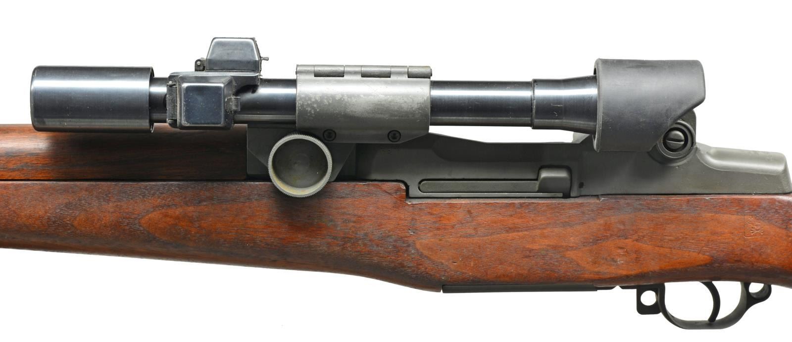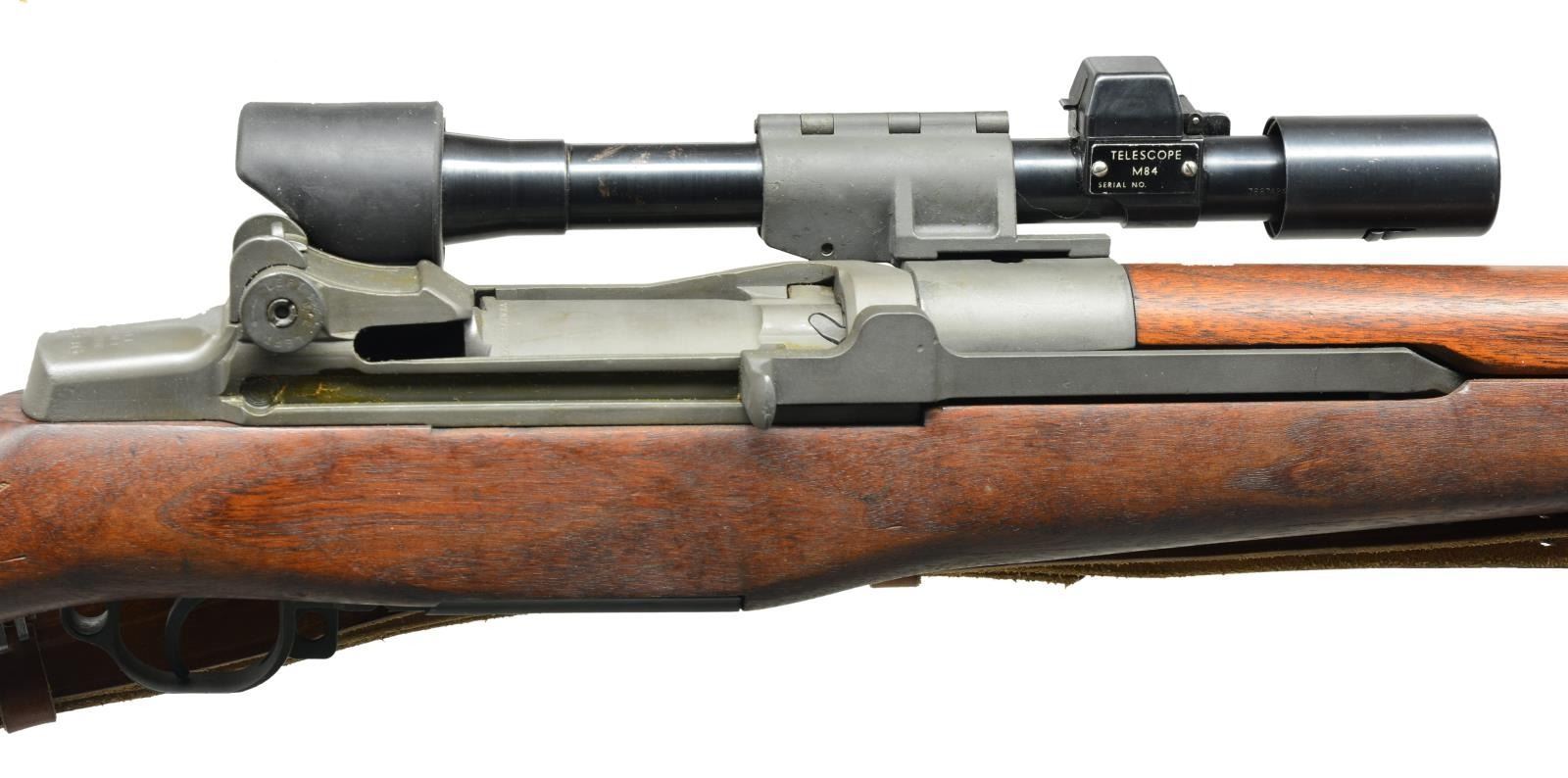 SNIPER CONFIGURATION. Cal. 30-06. S# 2448446. Bbl. 30" over T-37 prong type flash suppressor. Bbl. marked on left side w/ "WP" Winchester proof. Throat gauges 3.0. Muzzle gauges 9.0. Aperture rear sight. Blade front sight w/ protective ears. Rifle has been reconfigured to replicate the M1D Sniper Rifle. Bolt marked "WRA". Operating rod marked "IHC". Cross slot gas cyl. lock screw. Trigger housing marked "WRA". Hammer marked "SA". Rifle fitted w/ M84 telescopic sight. Scope appears original. S# is not marked on nomenclature plate. S# is marked on right forward end of scope tube & is numbered 7667424. Sliding sun shade at objective end of scope & rubber eye cup at ocular end. Post type reticle w/ horizontal crosshair. Optics appear clear & serviceable. Walnut stock set. Buttstock marked on left side w/ crisp defense acceptance eagle. Stock fitted w/ brown leather cheek pad, marked "MRP 11-62" & has military type leather sling. CONDITION: stock has attractive original finish w/ light wear, scattered scratches & handling marks. Several notable deep scratches on left side at pistol grip. Metal has arsenal rework type parkerization w/ light wear, scattered scratches & notable sm. area of pitting on left forward end of receiver. Bore turning dark w/ very fine pitting & lightly worn lands. (21-101/RW). MODERN. $1,200-1,800.
