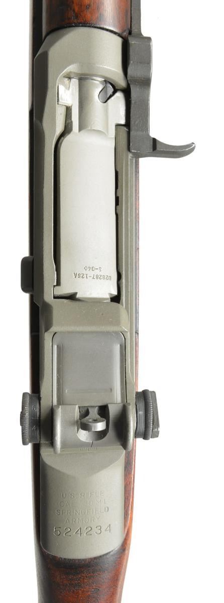 Cal. 30-06. S# 524234. Bbl. 24". Throat gauges 3.0. Muzzle gauges 4.5. Bbl. marked on right side “SA 2 OF 43”. Aperture rear sight w/ “BATTLE RANGE” elevation knob & “locking bar” windage knob. Blade front sight. Cross slot gas cyl. lock screw. All visible parts markings are “SA”. Milled trigger guard. Walnut stock set. Buttstock has faint crossed cannons on left side over trigger guard & faint encircled “P” under pistol grip. UNATTACHED ACCESSORIES: buttstock contains 2 plastic grease cups, plastic oiler w/ cleaning rod handle, 4 section cleaning rod in canvas pouch. CONDITION: stock set has arsenal rework type finish w/ moderate wear, staining & scattered handling marks. Rear handguard has 1" crack behind bbl. band. Front handguard has several sm. cracks at front & rear. Metal has arsenal rework type parkerisation w/ thinning & wear notable around cyl. & gas cyl. lock. Markings at rear of receiver are notably faint due to arsenal rework finish. Bore has moderate wear turning dark w/ lightly rounded lands. (21-100/RW). CURIO. $600-900.